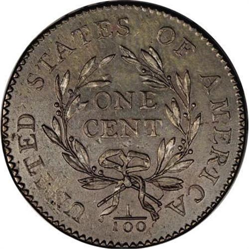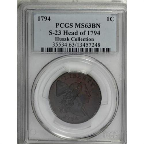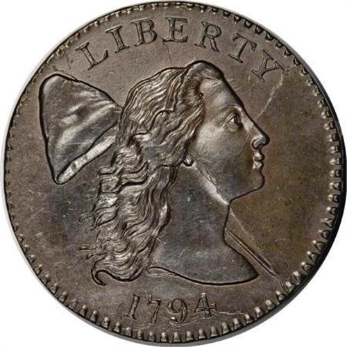 <B>1794 1C Head of '94. MS63 Brown PCGS. S-23, B-7, High R.4. </B></I> <B>Bland AU55; tied for CC-1. Noyes AU55; tied for CC-1. Photo #21756. Our EAC Grade AU55.<BR><BR>Equivalents. </B></I>Maris 13 (Standless 4); Frossard 9; Doughty 33; Hays 18; McGirk 4-C; Ross 12-K; Chapman 7; EAC 7; <I>Encyclopedia </B></I>1657; PCGS #901374.<BR><B><BR>Variety. </B></I>Date has a standless 4 missing its base. Numerator tall and resting on fraction bar. The obverse appears on S-23. The reverse appears on S-23 and S-24. Lettered Edge, leaf points up. This die marriage is usually identified by the obverse die cracks of State II and later states.<BR><B><BR>Surfaces. </B></I>Smooth surfaces with cartwheel luster exhibit medium brown and darker olive color, with a few minor splashes of maroon patina. Each side has a singular jagged lamination defect, on the obverse from the top of the head to BE, and on the reverse from the lower right leaf pair through the right stem and ribbon ends.<BR><B><BR>Die State V.</B></I> The obverse die is shattered with a crack from the border to the pole, neck, and head, eventually reaching the upper edge of the cap and border. Another crack from the border touches the right serif of Y to Liberty's nose, joining the first crack at the jaw. Breen mentions faint bulging on the reverse in this final die state, but it is not evident on this coin.<BR><BR><B>Appearances. </B></I>The obverse and reverse are illustrated in Noyes (1991 and 2006).<BR><BR><B>Census. </B></I>Noyes and Bland grade the two finest examples of S-23 as AU55. This piece is the single finest in collectors hands, with the other similar coin in the ANS Collection. Several examples follow that grade VF. Perhaps 15 examples of S-23 are known in VF or finer. Five of the top six pieces known today were known when <I>Penny Whimsy</B></I> was published. Sheldon mentioned this specimen, writing "the 50-coin is a discovery of recent months."<BR><BR><B>Commentary. </B></I>Perfect-die examples of this variety are extremely rare. In 1949 Sheldon knew of two, both in the ANS. One of those, tied with this coin for finest known honors, is plated in Breen's <I>Large Cent Encyclopedia</B></I>. Earlier, Chapman described the variety and a late die state, equivalent to the present specimen, noting that both states are very rare.<BR><BR>James Davy of England visited the first Mint in December 1794 and made several recommendations to the Secretary of State in a letter dated December 27. His purpose seems to have been either employment at the Mint, or to provide support to the Mint from his home. The Mint never hired Davy, and his recommendations were apparently not put in place, at least not right away. Frank Stewart described Davy as an efficiency engineer. It seems that Davy was quite familiar with coinage procedures in England, perhaps from an association with Boulton and Watt. Today, the Davy report is useful for its description of certain procedures in place at the time (quotes from the report are lightly edited):<BR><BR>"In the manufacturing of any article, the necessary articles to be attended to are, first, the procuring of an ample and regular supply of such materials as are required, in the state best calculated for the operations which are to be performed on them, and to answer best the purpose for which the article is ultimately designed; and secondly, the application of such power as are best calculated for performing most completely the necessary operation, in the shortest time, and with the least expense.<BR><BR>"Keeping in view these principles, I shall offer my opinions on the Mint of the United States of America, founded on the partial view I have obtained, of the information collected relative to it. I find the supply of copper has not been regular, that the power now applied is not adequate, nor are many parts of the machinery adapted for performing the work to the best advantage, and the labor is not sufficiently divided."<BR><BR><B>Provenance. </B></I><I>Discovered in England; Stack's (1957); C. Douglas Smith (6/1958); Dorothy I. Paschal; Dr. William H. Sheldon (4/1972); R.E. Naftzger, Jr. (2/1992); Eric Streiner (4/1992); Dr. Allen Bennett (2001).</B></I><BR><BR><B>Personality. Dr. Allen Bennett</B></I> recently described himself as a "reclusive physician." An active collector in many different fields, he assembled a remarkable collection of 1794 large cents from 1985 to 2001. He also collects, or has collected, contemporary art, oriental rugs, Conder tokens, and cowry shells. Bennett sold his 1794 cent collection to Walter Husak, and many of those coins appear in the present sale.<BR><BR><b>Shipping:</b> Coins & Currency (<a target="_blank" href="http://www.heritageauctions.com/common/shipping.php">view shipping information</a>)