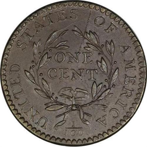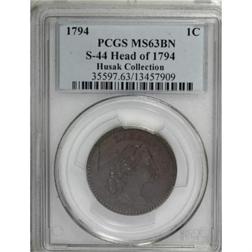 <B>1794 1C Head of '94. MS63 Brown PCGS. S-44, B-33, R.1.</B></I> <B>Bland MS60; CC-1. Noyes MS60; CC-1. Photo #21272. Our EAC Grade AU55.<BR><BR>Equivalents. </B></I>Maris 21 (Short Bust); Frossard 13.1; Doughty 42; Hays 33; McGirk 5-A, 5-A2; Ross 21-W; Chapman 36; EAC 31; <I>Encyclopedia </B></I>1668; PCGS #901374.<BR><B><BR>Variety. </B></I>Back of the bust is short; seven hair locks. Fraction bar long and pointed at left end; large berry left of C in CENT. The obverse appears on S-43, S-44, NC-5, and NC-10. The reverse appears on S-44. Lettered Edge, leaf points up. Some 1794 specialists feel this is the least attractive obverse of the year.<BR><B><BR>Surfaces. </B></I>Gorgeous light brown surfaces with excellent cartwheel luster, and splashes of lighter tan, faded from original red. Hints of deeper olive can be seen on the design highpoints. Fine handling marks are evident, primarily in the fields, with a small mark below the chin to identify the provenance. While the border is a bit shallow in places, the overall strike is excellent, with well-centered design motifs.<BR><B><BR>Die State IV.</B></I> Although not the terminal die state for the variety, both dies are advanced beyond the state of most survivors. Two obverse die cracks have fully developed. The first begins at the border below the 9, diagonally up to the left into the lower hair curls. The second follows the left edge of the cap, through the fields, to the lower hair curls. Breen notes that the two die cracks meet in the hair, but examination of this piece clearly shows that they are separate die cracks that run parallel within the lowest curls.<BR><B><BR>Appearances. </B></I>The reverse is illustrated in <I>Early American Cents</B></I> and <I>Penny Whimsy</B></I>. The obverse and reverse are illustrated in Noyes (1991 and 2006).<BR><B><BR>Census. </B></I>Although considered common with a Rarity-1 rating, this piece is the finest known, and the only example with claims to a Mint State grade. This coin has been known for about 100 years, yet the present sale is its first appearance in a public auction.<BR><B><BR>Commentary. </B></I>Many of the finest 1794 large cents have traded hands privately, never appearing in a public sale. Often, the private transactions involve large numbers of individual coins, such as Walter Husak's acquisition of the entire 1794 cent collection of Dr. Allen Bennett. Today the public auction of the Husak Collection presents the first opportunity to acquire many impressive pieces.<BR><BR><B>Provenance. </B></I><I>Virgil M. Brand; Carl Wurtzbach (1938); Dr. William H. Sheldon (4/1972); R.E. Naftzger, Jr. (2/1992); Eric Streiner; Anthony Terranova; Dr. Allen Bennett (1999).</B></I><BR><BR><B>Personality. Virgil Brand</B></I> was born in 1862 and spent nearly all of his life in Chicago, where he was successful in the brewery business. His birthplace is subject to debate, with Al Boka writing that he was born in Germany and Pete Smith asserting that he was born in Blue Island, Illinois. He was a hoarder of rare coins who amassed a collection in excess of 300,000 pieces. His estate took decades to settle after his death in 1926. A number of pieces remained in his estate for more than 50 years, and Bowers and Merena conducted a final "Virgil Brand Sale" in 1985. Dave Bowers wrote a biography, <I>Virgil Brand: The Man and his Era</B></I>, in 1983.<BR><BR><b>Shipping:</b> Coins & Currency (<a target="_blank" href="http://www.heritageauctions.com/common/shipping.php">view shipping information</a>)