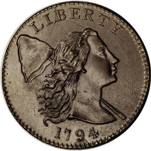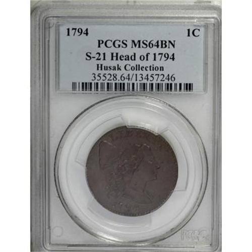 <B>1794 1C Head of '94. MS64 Brown PCGS. S-21, B-5, R.3. </B></I> <B>Bland MS60; CC-2. Noyes MS60; CC-2. Photo #21541. Our EAC Grade MS60.<BR><BR>Equivalents. </B></I>Maris 3 (Sans Milling); Frossard 22; Doughty 21; Hays 5; McGirk 8-C; Ross 4-A; Chapman 5; EAC 5; <I>Encyclopedia </B></I>1656; PCGS #901374.<BR><B><BR>Variety. </B></I>End of the pole is wide and flattened. Dentils, stems, and ribbons are unusually long. The obverse appears on S-21. The reverse appears on S-19a, S-19b, S-20, S-21, and NC-7. Lettered Edge, leaf points up.<BR><B><BR>Surfaces. </B></I>Sharply detailed with exceptional mahogany and light brown color, faded from original red luster. A slightly darker splash of toning is visible beneath the 9, and additional splashes of maroon are evident on each side, especially at the center of the obverse. The full border details, especially on the obverse, make this piece especially desirable.<BR><B><BR>Die State IV.</B></I> The obverse is cracked from the rim to the upper serif of B, between IB, to the cap. Another crack begins at the top of the first crack to the top of L, curving down through IB and across the first crack, through the forecurl and forehead to the upper corner of the eyelid. A short crack is visible from the lower left corner of the cap to the rim, and from the center of this crack up to the left center of the cap. Faint clash marks can be seen in the right obverse field. The reverse has advanced die roughness through both branches of the wreath, with heavy clash marks inside the wreath.<BR><BR>Breen described a later die state (State V) with a crack from the rim to the second curl point from the bottom. A flowline at that location may be the feature that Breen called a crack.<BR><B><BR>Appearances. </B></I>The obverse is illustrated in <I>Penny Whimsy</B></I>. The obverse and reverse are illustrated in Breen's <I>Complete Encyclopedia</B></I> and in Noyes (2006).<BR><BR><B>Census. </B></I>A single example is placed ahead of this coin in the Noyes and Bland Census listings, these being the only two Mint State pieces known. Walter Husak owned the other Mint State specimen before he acquired this coin.<BR><BR><B>Commentary. </B></I>Sheldon wrote: "Maris called this the Sans Milling, because the milling is rarely (if ever) seen complete on the obverse." An examination of the plates in Bill Noyes' <I>United States Large Cents 1793-1794</B></I> will show weak obverse border detail on most examples.<BR><BR>While some large cents frequently trade hands, others remain in collections for long periods. This piece, the second finest known, has been in just seven collections over the last 140 years, an average of 20 years per owner. Sheldon discussed this coin in <I>Penny Whimsy</B></I>: "On objective scrutiny only the Proskey-Hines piece seems to stand up to the rather rigorous criteria of MS-60."<BR><BR>Dr. Edward Maris described 39 varieties of 1794 large cents in his 1869 reference: "The interest excited in the minds of collectors by their variety - a consequence probably of the breakage of dies - is shared by the writer, and has resulted in this attempt to describe the most noticeable peculiarity of each with sufficient accuracy to enable the careful examiner to recognize any given specimen, in a condition not below fair." For the Maris 3 variety, the author wrote: "Not the slightest trace of any milling on this side of the coin, contrasts with the reverse, which is protected by a bold and serrated elevation around the edge."<BR><BR><B>Provenance. </B></I><I>Dr. Edward Maris; David Proskey; Henry C. Hines; Dr. William H. Sheldon (4/1972); R.E. Naftzger, Jr. (Early American Coppers, 4/1989), lot 21 $15,000; Dr. Allen Bennett.</B></I><BR><BR><B>Personality. Dr. Edward Maris</B></I> was born outside Chester, Pennsylvania, on March 15, 1832, the son of Jesse J. Maris who was president of the Delaware County Bank. Maris is described as a Quaker physician who graduated from Jefferson Medical College in 1856. He was associated with the Philadelphia Dispensary for 16 years, then began a private practice. In numismatics, he is best known for his interest in New Jersey coppers and large cents, and wrote books about both series. His reference on the New Jersey series remains the standard reference today. Many of his names for 1794 large cents are still seen in today's literature. Maris was a member of the ANS and an avid collector of autographs and manuscripts. Maris died at his home in June 1900.<BR><BR>Lapp and Silberman note: "He was a worthy member of the Society of Friends and wore the broad-brimmed hat and quiet attire of the Quakers throughout his life. In his conversation and correspondence he adhered to the ‘thee' and ‘thou' familiar to his sect. He had a prominent Roman nose and a strong-featured, shaven face. He lived simply in a commodious home at 1106 Pine Street in the old residential section of Philadelphia. He actively pursued his profession as a physician, but he was ever on the watch about town for coins of interest and in his quiet way he dealt largely in them."<BR><BR><b>Shipping:</b> Coins & Currency (<a target="_blank" href="http://www.heritageauctions.com/common/shipping.php">view shipping information</a>)