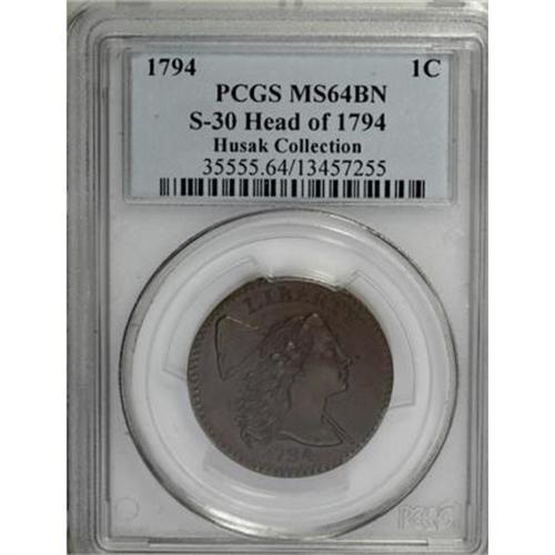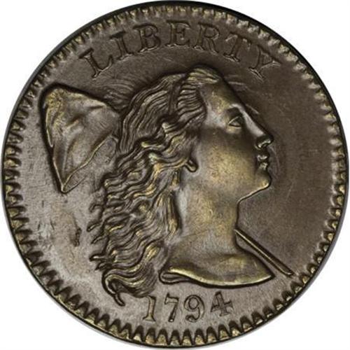 <B>1794 1C Head of '94. MS64 Brown PCGS. S-30, B-12, R.1. </B></I> <B>Bland MS60; tied for CC-1. Noyes MS65; CC-1. Photo #20145. Our EAC Grade MS60.<BR><BR>Equivalents. </B></I>Maris 26 (Amatory Face [1869]; Amiable Face [1870]); Frossard 16.1; Doughty 46; Hays 37; McGirk 11-B; Ross 23-Q; Chapman 22; EAC 15; <I>Encyclopedia </B></I>1660; PCGS #901374.<BR><B><BR>Variety. </B></I>The Marred Field. Right ribbon long, nearly touching dentils. The obverse appears on S-30 and S-31. The reverse appears on S-29 and S-30. Lettered Edge, leaf points up.<BR><B><BR>Surfaces. </B></I>Stunning chestnut and mahogany surfaces are accompanied by hints of gold toning on each side. The obverse has satiny luster with reflective fields; the reverse is frosty with full cartwheel luster.<BR><B><BR>Die State IV.</B></I> A later die state with heavy die erosion below STATES OF and a crack through R to the wreath. It is apparently the earliest use of the obverse die, with the field chips behind the hair curls only beginning to form.<BR><B><BR>Appearances. </B></I>The obverse and reverse are illustrated in <I>Early American Cents</B></I>, <I>Penny Whimsy</B></I>, Noyes (1991 and 2006), and Boka. The obverse is illustrated in Morley as MS60.<BR><B><BR>Census. </B></I>This specimen easily ranks as the finest known piece, and the only example called Mint State by Noyes. One other coin is also graded Mint State according to Bland, but is called AU55 by Noyes.<BR><B><BR>Commentary. </B></I>Sheldon-30, 31, 38-40, and NC-2 are all known as "Marred Field" varieties, each with similar die chips in the left obverse field. These provide numismatists with a bit of a challenge, as all three obverses have similarities and differences. In <I>Early American Cents</B></I> and <I>Penny Whimsy</B></I>, Sheldon described three different obverse dies. In his <I>Large Cent Encyclopedia</B></I>, Walter Breen identified all of these varieties from a single obverse die with S-30 in the earliest state, and the others from lapped versions of this die. Today, this position has been accepted by most students of the series.<BR><BR>In his first edition, Dr. Maris called the variety the Amatory Face and commented: "Physiognomy that of a lady in love." This lady, once owned by Dr. Maris and probably the coin he was describing at the time, is easy to love! A year later Maris downgraded his description to Amiable Face in the second edition.<BR><BR><B>Provenance. </B></I><I>Dr. Edward Maris; later, Col. E.H.R. Green; B.G. Johnson (St. Louis Stamp & Coin Co., 3/1943); Abe Kosoff; Oscar Pearl (Numismatic Gallery, 1944 FPL), lot 54, $225; T. James Clarke (1950); Dr. William H. Sheldon (4/1972); R.E. Naftzger, Jr. (2/1992); Eric Streiner (4/1992); Dr. Allen Bennett (1/2000).</B></I><BR><BR><B>Personality. Edward Howland Robinson Green</B></I> was the son of Hetty Green, the "Witch of Wall Street." He was born in London on August 22, 1868, while his parents were on a European tour. His death occurred in Lake Placid, New York, on June 8, 1936. By all accounts, Hetty Green was quite miserly, and refused to hire a doctor to treat her son when he injured his leg. This action caused Col. Green to lose his leg. He graduated from Fordham College in 1888 and was admitted to the bar. Green was active in politics for the Republican Party and chaired the Texas Republican State Committee. He was on the board of directors for the 1904 St. Louis World's Fair, served as a director of the Baltimore and Ohio Railroad, and was president of the Texas Midland Railroad. After his death in 1936, his coin collection was valued at $5 million and his stamp collection at $3.5 million.<BR><BR><b>Shipping:</b> Coins & Currency (<a target="_blank" href="http://www.heritageauctions.com/common/shipping.php">view shipping information</a>)
