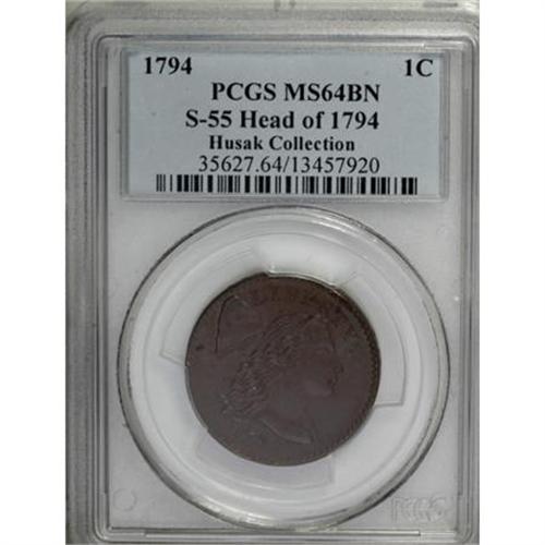 <B>1794 1C Head of '94. MS64 Brown PCGS. S-55, B-47, R.2.</B></I> <B>Bland MS60; CC-1. Noyes AU50; CC-1. Photo #21183. Our EAC Grade AU55.</B></I><BR><BR><B>Equivalents. </B></I>Maris 9; Frossard 5.3; Doughty 29; Hays 13; McGirk 2-A; Ross 8-G; Chapman 44; EAC 45; <I>Encyclopedia </B></I>1668; PCGS #901374.<BR><BR><B>Variety. </B></I>Date has 7 leaning sharply to the right. A in STATES high, close to first T, and leans to the left. The obverse appears on S-54, S-55, and S-56. The reverse appears on S-55. Lettered Edge, leaf points up. Sheldon called this the "Big Berries" variety, due to the size of the berries in the wreath.<BR><BR><B>Surfaces. </B></I>An impressive piece with gorgeous mahogany surfaces, excellent cartwheel luster, and faint traces of original mint red on each side. The left obverse field has a tiny planchet defect or chip behind the cap, an excellent provenance marker.<BR><BR><B>Die State II.</B></I> The obverse is always cracked from the left border to the hair, just above the sixth lock. This crack formed during the previous marriage for S-54. A faint crack in the lower curls has advanced to the bottom lock behind the shoulder, and diagonally up to the left through several hair strands. Faint clash marks can be seen in the obverse fields.<BR><BR><B>Appearances. </B></I>The obverse and reverse are illustrated in <I>Early American Cents</B></I>, <I>Penny Whimsy</B></I>, and Noyes (1991 and 2006).<BR><BR><B>Census. </B></I>Noyes and Bland both consider this example finest known, although they disagree about the grade. Bland calls it Mint State and Noyes grades it AU50. Noyes considers the surfaces to be average.<BR><BR><B>Commentary. </B></I>There is no doubt that the interpretation of grading standards has changed over the years, even in regard to the conservative criteria employed by early copper collectors. For example, Sheldon discussed this specific coin in <I>Penny Whimsy:</B></I> "The Shumway-Hines piece appears to stand alone at MS65, with the Newcomb coin an excellent second at AU50." A half century later, the Shumway-Hines piece is still considered finest known, but is only graded AU50 to MS60, depending on whose grades are preferred. The Newcomb coin is now considered XF45 by Noyes and AU50 by Bland.<BR><BR><B>Provenance. </B></I><I>Frank Shumway; Henry C. Hines; Dr. William H. Sheldon (4/1972); R.E. Naftzger, Jr. (2/1992); Eric Streiner; Jay Parrino; Anthony Terranova (6/1996).</B></I><BR><BR><B>Personality. John Smith Gardner</B></I> served the Mint in the mid 1790's as assistant engraver under Robert Scot, who did not welcome the assistance. Gardner engraved dies and created device punches during his brief tenure from November 1794 until March 1796. Scott, whose competence has been questioned by many, may have been jealous of Gardner's superior skills. After leaving the Mint, he worked as a seal cutter. He also invented the Stenographic Telegraphic, a device that translated speech into telegraphic characters, a forerunner of court recording devices.<BR><BR><b>Shipping:</b> Coins & Currency (<a target="_blank" href="http://www.heritageauctions.com/common/shipping.php">view shipping information</a>)