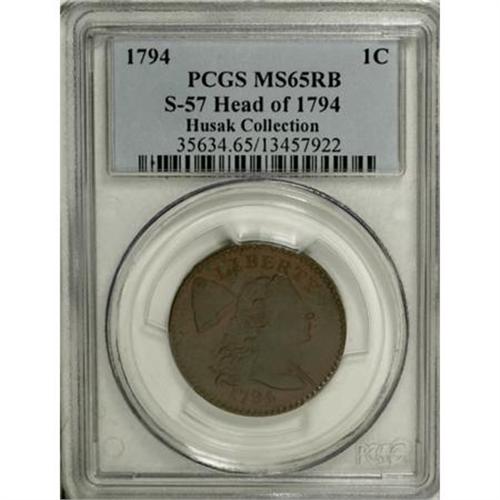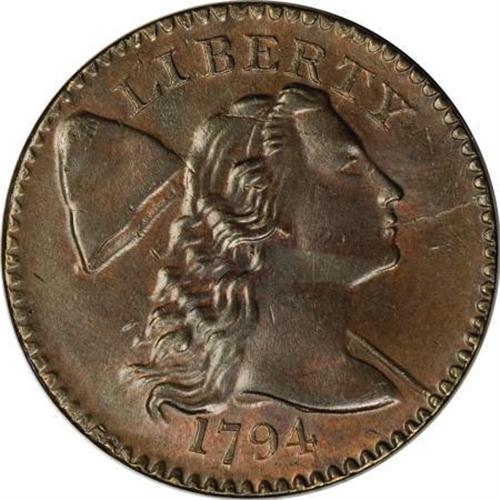 <B>1794 1C Head of '94. MS65 Red and Brown PCGS. S-57, B-55, R.1.</B></I> <B>Bland MS64; CC-1. Noyes MS65; tied for CC-1. Photo #21180. Our EAC Grade MS64.</B></I><BR><BR><B>Equivalents. </B></I>Maris 10 (Pyramidal Head); Frossard 6; Doughty 30; Hays 14; McGirk 6-A; Ross 9-H; Chapman 46; EAC 47; <I>Encyclopedia </B></I>1668; PCGS #901375.<BR><BR><B>Variety. </B></I>Liberty cap has a button at the lower left corner. Lowest berries joined to left ribbon bow. The obverse appears on S-57. The reverse appears on S-57. Lettered Edge, leaf points up.<BR><BR><B>Surfaces. </B></I>Fully lustrous with frosty surfaces, this piece retains considerable original mint color on both sides. The impression is nicely centered with full obverse and reverse borders. A thin planchet defect on top of the head will identify this piece to future researchers. The edge is lettered ONE HUNDREDOR A DOLLAR with the final D and the F overlapping.<BR><BR><B>Die State VI.</B></I> A faint die crack can be seen from the upper lip through the cheek to the temple on this late die state piece.<BR><BR><B>Appearances. </B></I>The obverse and reverse are illustrated in Noyes (1991 and 2006).<BR><BR><B>Census. </B></I>The St. Oswald collection included two examples of this variety, both of similar quality. Del Bland places this coin slightly ahead of the other specimen, while Bill Noyes considers both to be equal and tied for finest known. Two or three others are known that grade MS60.<BR><BR><B>Commentary. </B></I>This example is another impressive Gem cent from the St. Oswald collection. Although a few of the St. Oswald coins represent rare varieties, such as the S-45 described above, most of these cents provide date and type collectors with the opportunity to acquire a high quality coin without a substantial variety premium.<BR><BR>Dr. Maris called this variety the Pyramidal Head for the distinct shape of Liberty's bust and hair. Dr. Sheldon further commented that the hair treatment on the obverse is "in even flatter relief than obverse 26 [S-54, 55, 56], and presenting the same straight sweep down the hair at the left which suggests the outline of a pyramid." Sheldon continued: "The Pyramidal Head with its flat relief and its button on the cap is an old and everyday friend among cent people. Common in all grades of condition except near Mint State."<BR><BR><B>Provenance. </B></I><I>St. Oswald Collection (Christie, Manson, & Woods, Ltd., 10/1964), lot 150, $2,100; Stack's; Dorothy Paschal; Dr. William H. Sheldon (4/1972); R.E. Naftzger, Jr. (2/1992); Eric Streiner; Jay Parrino; Superior (9/1997), lot 38, $44,000; Dr. Allen Bennett (1/1998).</B></I><BR><BR><B>Personality. </B></I>A coin dealer in Kansas City, <B>Jay Parrino</B></I> operates The Mint, L.L.C., specializing in the highest quality material. He purchased many of the Naftzger large cents from Eric Streiner in 1992.<BR><BR><b>Shipping:</b> Coins & Currency (<a target="_blank" href="http://www.heritageauctions.com/common/shipping.php">view shipping information</a>)