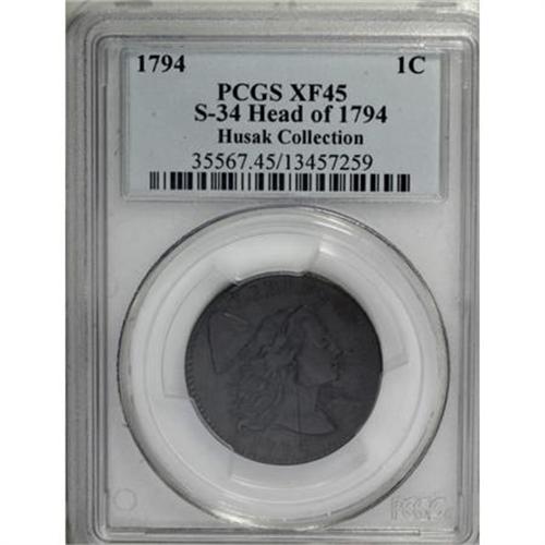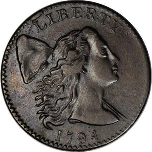 <B>1794 1C Head of '94. XF45 PCGS. S-34, B-20, High R.5. </B></I> <B>Bland VF30; CC-2. Noyes VF30; CC-2. Photo #39970. Our EAC Grade VF30.<BR><BR>Equivalents. </B></I>Maris 19; Frossard 25.2; Doughty 40; Hays 28; McGirk 1-B; Ross 17-T; Chapman 13; EAC 19; <I>Encyclopedia </B></I>1662; PCGS #901374.<BR><B><BR>Variety. </B></I>Fourth and sixth locks from bottom turn upward. Single berry left of ribbon bow; lowest leaf points to final A. The obverse appears on S-32, S-33, and S-34. The reverse appears on S-34, S-35, and NC-1. Lettered Edge, leaf points up. The first of two "Single Berry" reverse dies. On each of these dies, used for six different die combinations, there is just one berry inside the left branch of the wreath beside the ribbon bow. All other 1794 reverse dies have two berries in this location.<BR><BR><B>Surfaces. </B></I>The reverse appears a few points finer overall. Medium brown color with pale blue iridescence. The edge is marked "H-19" to represent the Maris number. A tiny reverse rim nick is located at 12:30.<BR><BR><B>Die State III.</B></I> The obverse always has a rim break over LI with an extension to the Liberty cap, and this example is cracked entirely through the top of the cap. The crack is heavy, and has the appearance of a retained cud. The reverse, rotated slightly counterclockwise, is uncracked, but with light clash marks.<BR><BR><B>Appearances. </B></I>The obverse and reverse are illustrated in Frossard-Hays, Boka, and Noyes (2006). The obverse is illustrated in Morley, according to Bland, apparently the VF35 example. Although the Breen <I>Large Cent Encyclopedia</B></I> plate coin is identified as this specimen, the plate actually depicts the finest known example, which has since been recovered by the ANS.<BR><BR><B>Census. </B></I>The finest example available to collectors and the second finest known, behind a slightly better coin that was recently returned to the ANS.<BR><BR><B>Commentary. </B></I>The single berry feature is shared by two reverse dies, which are well known among large cent collectors, who love to cherrypick any example they can find. All six varieties from the two dies are rare, each rated Rarity-5 or higher. In 1949 Sheldon noted that S-34 was rarer than S-33 with just six examples known. Today somewhat more than 30 are known.<BR><BR><B>Provenance. </B></I><I>Dr. Thomas Hall; W.W. Hays; Dr. Thomas Hall (9/1909); Virgil M. Brand (2/1941); B.G. Johnson (St. Louis Stamp & Coin Co., 9/1943); Oscar Pearl (Numismatic Gallery, 1944 FPL), lot 45, $95; Dr. William H. Sheldon; ANS (1/2001); R.E. Naftzger, Jr. (2/2001).</B></I><BR><BR><B>Personality. William Wallace Hays</B></I> was a 19th century collector of coins, stamps, autographs, and old china. He was born on June 7, 1821, in Bellefonte, Pennsylvania and died there on July 9, 1899. Hays was employed by the Pension Office in Washington, D.C. His reference on 1794 large cents, <I>Varieties of United States Cents of the Year 1794</B></I>, was published in 1893. Co-authored by Ed. Frossard, it became the standard reference for many years, quickly replacing the Maris reference on 1794 cents and Frossard's 1879 <I>Monograph</B></I> on the early coppers. Hays collected 1794 cents and marked the edges of each with Maris numbers in white ink.<BR><BR><b>Shipping:</b> Coins & Currency (<a target="_blank" href="http://www.heritageauctions.com/common/shipping.php">view shipping information</a>)