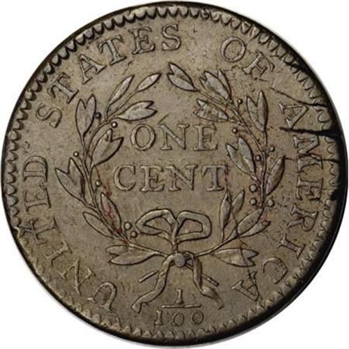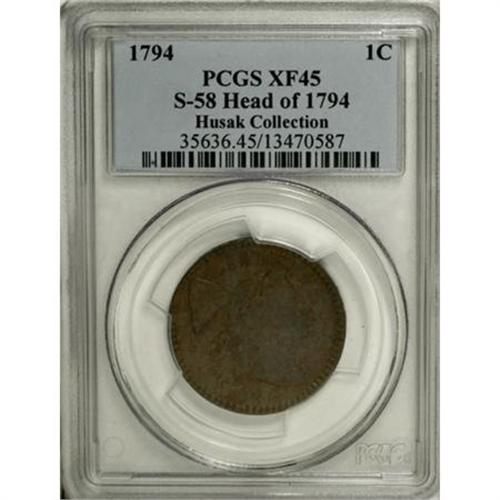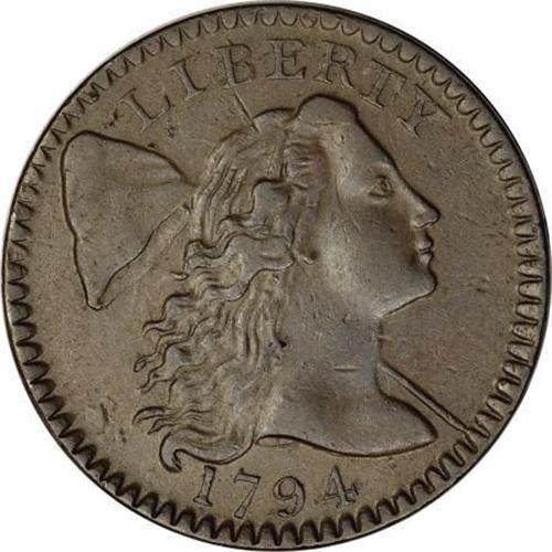 <B>1794 1C Head of '94. XF45 PCGS. S-58, B-56, R.3.</B></I> <B>Bland VF30; tied for CC-10. Noyes VF35; CC-6. Photo #35436. Our EAC Grade VF35.</B></I><BR><BR><B>Equivalents. </B></I>Maris 40; Frossard 7.2; Doughty 60; Hays 16; McGirk 4-A; Ross 10-J; Chapman 39; EAC 48; <I>Encyclopedia </B></I>1668; PCGS #901374.<BR><BR><B>Variety. </B></I>Date is widely spaced, hair is thick and luxuriant. Fraction bar begins over right edge of 1. The obverse appears on S-58 and S-59. The reverse appears on S-58. Lettered Edge, leaf points up.<BR><BR><B>Surfaces. </B></I>Intermingled tan, golden-brown, and dark steel on both sides with a small patch of maroon verdigris on the reverse. Several heavy planchet defects are evident along the reverse border. These defects are strictly "as made" and should not affect the grade, but are certainly a tie-breaker in the case of borderline decisions.<BR><BR><B>Die State III.</B></I> The reverse has a heavy die crack through UNIT, although not developed to a retained cud or full cud.<BR><BR><B>Appearances. </B></I>The obverse and reverse are illustrated in Noyes (2006).<BR><BR><B>Census. </B></I>Finest known for the variety is an AU55 specimen, followed by several XF coins (three per Noyes, seven per Bland), and several more in the VF grade range. Opportunities to acquire a high quality example of S-58 are limited.<BR><BR><B>Commentary. </B></I>On October 28, 1794, David Rittenhouse communicated his report to the President and the Senate:<BR><BR>"The expenses of the mint have hitherto been chiefly applied only preparatory towards carrying on the business of the establishment; in erecting the necessary buildings, furnaces for melting, refining, and assaying, etc. (for which purpose it has been found necessary to purchase an additional lot of ground) and the very extensive machinery used in the different operations of coining; nearly one million of cents have, however, been coined and paid into the treasury of the United States, and a beginning has been made in coining the precious metals; near 120,000 ounces of bullion have already been deposited in the mint for coinage, a considerable quantity of which, being too base for the standard of the United States, has, in part, been successfully refined by the assayer, who is still going on with that process. A large parcel of blank dollars is ready for coining, waiting for a more powerful press to be finished, in order to complete them for currency. A large quantity of copper still remains on hand, part of it not yet refined. This will be wrought occasionally, so as not to interfere with the silver coinage."<BR><BR><B>Provenance. </B></I><I>B.G. Johnson; Mary Cowan Cruzan (Spink America, 6/1997), lot 96, $1,210; Jack Wadlington.</B></I><BR><BR><B>Personality. W.M. "Jack" Wadlington</B></I> is a retired commodities trader whose large cent collection, recently sold through Chris McCawley, was characterized by both completeness and quality. His collection was nearly complete by both Sheldon and Newcomb number, lacking only three unique late-date varieties. In addition, he acquired 33 of the Sheldon "NC" varieties. His additional collecting interests include Colonial coins and numismatic literature.<BR><BR><b>Shipping:</b> Coins & Currency (<a target="_blank" href="http://www.heritageauctions.com/common/shipping.php">view shipping information</a>)