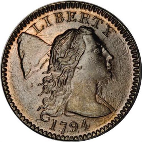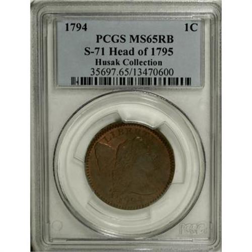 <B>1794 1C Head of '95. MS65 Red and Brown PCGS. S-71, B-63, R.2.</B></I> <B>Bland MS68; CC-1. Noyes MS67; CC-1. Photo #20519. Our EAC Grade MS65.<BR><BR>Equivalents. </B></I>Maris 37 (Plicae); Frossard 20a; Doughty 57; Hays 52; McGirk 4-I; Ross 32-II; Chapman 57; EAC 61; <I>Encyclopedia </B></I>1669; PCGS #1366.<BR><B><BR>Variety. </B></I>Head of '95; three short lines across bridge of nose. Leaf triplet at D; double leaf at OF. The obverse appears on S-71. The reverse appears on S-70 and S-71. Lettered Edge, leaf points up.<BR><B><BR>Surfaces. </B></I>Sharply struck and nicely centered, this piece retains at least 50% of its original fiery red mint color, along with medium olive and pale blue iridescence. The surfaces are exquisite, with only a few tiny blemishes.<BR><B><BR>Die State IV.</B></I> Both sides have prominent clash marks, especially the obverse with much of MERICA clashed in the field. Several die cracks are also evident, including that through the tops of LIBE, from near the date across the pole, and across the top of the head.<BR><B><BR>Appearances. </B></I>The obverse and reverse are illustrated in Noyes (1991 and 2006). Del Bland records the obverse illustrated on the 1893 Frossard-Hays plate. If the obverse actually did appear on the Hays plate, it would tend to create some questions regarding the supposed provenance of coins in the St. Oswald collection.<BR><B><BR>Census. </B></I>This is clearly the finest example of the variety, and it is one of two pieces in the Husak Collection that are apparently tied for honors as the finest 1794 large cent, the other the S-67 discussed above. In addition to two Mint State coins listed by Noyes in his <I>Official Condition Census</B></I>, two others grade AU55, and the next finest are one XF45 coin and three that grade XF40.<BR><B><BR>Commentary. </B></I>Although S-71 is one of the common 1794 varieties, it is scarce in higher grades. This was true when Dr. Sheldon wrote about the early cents, and it remains true today. In <I>Early American Cents,</B></I> Sheldon stated: "Far from rare, but another variety hard to find better than VF. ... An Eastern collector, particularly fond of this variety, has four of them, all between EF-40 and AU-50, bought at an average cost of about $55 each [prior to 1949]. It is because of the existence of little ‘silent' accumulations like this, which may lie dormant for a generation or two, that no one's opinion on the exact rarity of a variety should be taken as final authority."<BR><BR>The various publications describing varieties of early large cents give us some indication of the discovery progress over the past 140 years. Dr. Edward Maris provided our first listing of the 1794 varieties in 1869 with descriptions of 39 different varieties. A year later, his second edition added four die combinations. The next publication to deal with this coinage date was the William Wallace Hays reference published in 1893, although Ed. Frossard described some varieties in 1879. Hays recorded 56 different die varieties, with 59 varieties described in the 1910 revision of his work produced by Thomas Elder. Samuel Hudson Chapman recorded a similar number of varieties in 1926. There were no additional varieties discovered by the time that Sheldon published <I>Early American Cents</B></I> in 1949, but he added two more die combinations by the time of his revision in 1958, titled <I>Penny Whimsy</B></I>. Today, there are 65 different die varieties of 1794 cents known, all recorded by Walter Breen in his <I>Encyclopedia of Early United States Cents</B></I>.<BR><BR><B>Provenance. </B></I><I>St. Oswald Collection (Christie, Manson, & Woods, Ltd., 10/1964), lot 166, $2,940; A.H. Baldwin & Sons, Ltd. (London); Dorothy Paschal; Dr. William H. Sheldon (4/1972); R.E. Naftzger, Jr. (2001).</B></I><BR><BR><B>Personality. </B></I>This specimen is one of several 1794 cents in the Husak Collection that are provenanced to the <B>St. Oswald </B></I>Collection. The collection belonged to Major Sir Rowland Denys Guy Winn, M.C., 4th Baron St. Oswald. The collection was sold by Christie, Manson & Wood, Ltd. of London in October 1964.<BR><BR>Baron St. Oswald was a title given to royalty of Nostell, York, United Kingdom. The first Baron St. Oswald was Rowland Winn (1820-1893), a Member of Parliament from 1868 to 1885, representing Lincolnshire North. His son, also Rowland Winn (1857-1919) was the second Baron St. Oswald, and he served as a Member of Parliament from 1885 to 1893. The third was Rowland George Winn (1893-1957), followed by Rowland Denys Guy Winn (1916-1984). The fifth Baron St. Oswald was Derek Edward Anthony Winn (1919-1999) and today, the sixth Baron St. Oswald is Charles Rowland Andrew Winn, born 1959.<BR><BR><b>Shipping:</b> Coins & Currency (<a target="_blank" href="http://www.heritageauctions.com/common/shipping.php">view shipping information</a>)