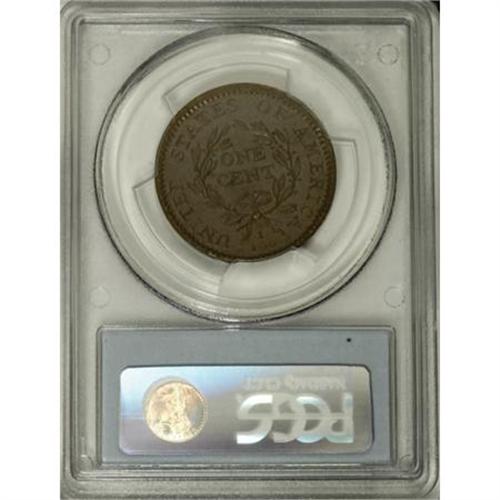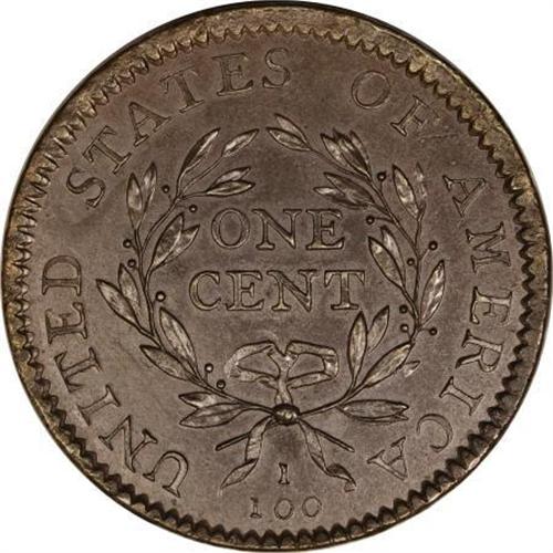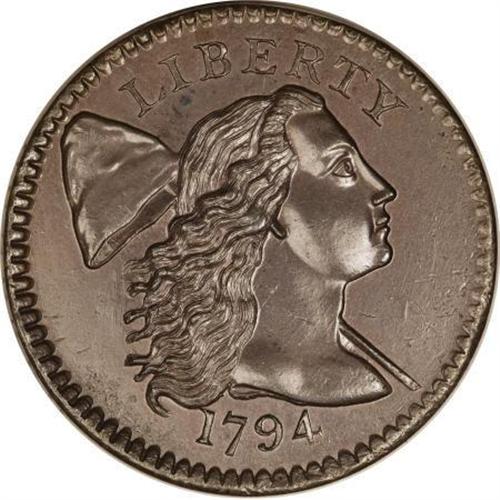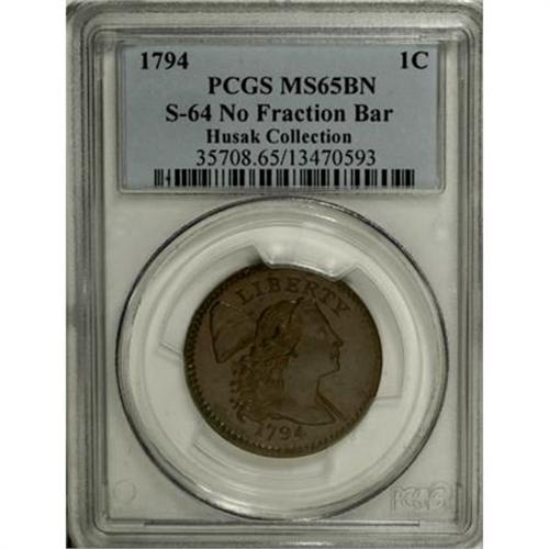 <B>1794 1C Missing Fraction Bar. MS65 Brown PCGS. S-64, B-50, Low R.5.</B></I> <B>Bland MS67; CC-1. Noyes MS62; CC-1. Photo #21405. Our EAC Grade MS60+.<BR><BR>Equivalents. </B></I>Maris 33; Frossard 19.2; Doughty 53; Hays 46; McGirk 6-F; Ross 28-FF; Chapman 48; EAC 53; <I>Encyclopedia </B></I>1666; PCGS #911374.<BR><B><BR>Variety. </B></I>Shielded Hair, the left border is deep. Missing Fraction Bar. The obverse appears on S-64, S-65, and NC-6. The reverse appears on S-64. Lettered Edge, leaf points up.<BR><B><BR>Surfaces. </B></I>Attractive medium brown color with hints of blue, retaining traces of faded mint red on each side. The surfaces are prooflike. This lovely piece is sharply struck and well centered, a stunning example.<BR><B><BR>Die State I. </B></I>An early die state with a perfect reverse, before a die crack developed through the D of UNITED. Walter Breen suggested the possibility of an even earlier die state, before the reverse die was lapped. His hypothetical early die state would still have the fraction bar, and "might be taken for a new die."<BR><BR><B>Appearances. </B></I>The obverse and reverse are illustrated in Chapman, <I>Early American Cents, Penny Whimsy</B></I>, Breen's <I>Complete Encyclopedia, </B></I>and Noyes (1991 and 2006).<BR><BR><B>Census. </B></I>Both Del Bland and Bill Noyes consider this piece to be the finest known example of S-64, although they differ in their individual grade assessment. One other piece may or may not grade Mint State, with a few examples known in the AU grade range.<BR><BR><B>Commentary. </B></I>The S-64 is a distinct "major variety" that is listed in the <I>Guide Book</B></I>, and it remains quite scarce with only about 60 to 70 examples known in all grades.<BR><BR>Dr. Maris did not have a distinct name for this variety, and in his first (1869) edition, he made no mention of the missing fraction bar, although he did describe this feature in his second (1870) edition.<BR><BR><B>Provenance. </B></I><I>John G. Mills (Chapman Brothers, 4/1904), lot 1243, $36; George H. Earle, Jr. (Henry Chapman, 6/1912), lot 3386, $65; Clarence Bement (Henry Chapman, 5/1916), lot 296, $116; Howard R. Newcomb (J.C. Morgenthau, 2/1945), lot 61, $140; Dr. William H. Sheldon (4/1972); R.E. Naftzger, Jr. (2/1992); Eric Streiner (8/1992); Dr. Allen Bennett (2001).</B></I><BR><BR><B>Personality. John G. Mills</B></I> was a resident of Albany, New York, who formed an impressive numismatic cabinet that included 160 large cents. The Chapman brothers sold his collection in April 1904.<BR><BR><b>Shipping:</b> Coins & Currency (<a target="_blank" href="http://www.heritageauctions.com/common/shipping.php">view shipping information</a>)