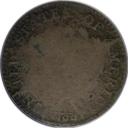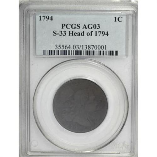<B>1794 1C Head of 1794 AG3 PCGS.</B></I> S-33, B-19, R.6. The famous Wheelspoke Variety is named for the radial die cracks that extend inward from the reverse border. All known examples of this variety have a bulged central reverse from die sinking. As a result, the variety is difficult to grade. In fact, we rate this piece finer than PCGS for its overall quality. <BR> In his recent photo book, Bill Noyes records 24 examples of the variety in grades ranging from VF25 down to Basal State (Poor) 1, and illustrates 23 of them. The present example does not match any of the illustrations, and is apparently a new discovery, increasing the known population of the variety to 25 coins. It has attractive dark olive and steel surfaces with faint corrosion on each side. A small mark tangent to Liberty's chin is the only noticeable flaw. EAC 4.<BR><BR><b>Shipping:</b> Coins & Currency (<a target="_blank" href="http://www.heritageauctions.com/common/shipping.php">view shipping information</a>)