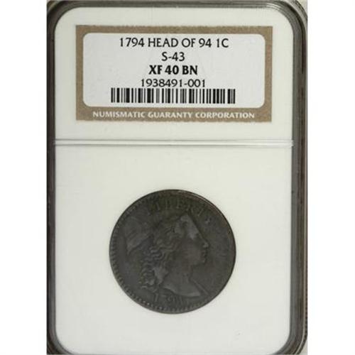 <B>1794 1C Head of 1794 XF40 NGC.</B></I> S-43, B-32, High R.2. Breen Die State I. Short Bust, Lowest Curl Clipped. The back of the bust at the shoulder does not meet the first strand of hair, a diagnostic for identification. This is a really fine example for the grade that shows even chocolate-brown coloration, except for traces of silver-gray on the highest design points. The right side denticles are softly struck on both the obverse and the reverse. Evenly worn and free of any distracting marks. An appealing example that approaches Condition Census status for the variety. EAC 20.<BR><BR><b>Shipping:</b> Coins & Currency (<a target="_blank" href="http://www.heritageauctions.com/common/shipping.php">view shipping information</a>)