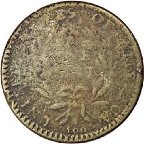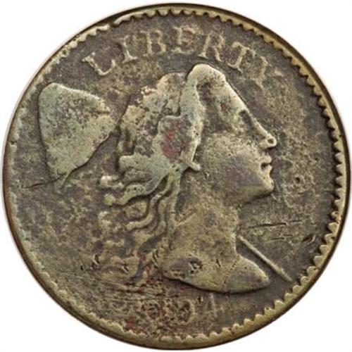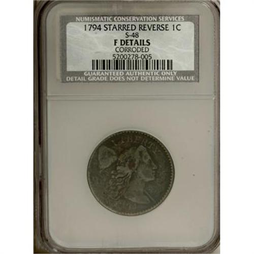 <B>1794 1C Starred Reverse--Corroded--NCS. Fine 12 Details.</B></I> S-48, B-38, R.5. The Starred Reverse, one of the few coins that are discussed among numismatists without the need to mention a date, or even a denomination. Today, about 60 examples are known in all grades, and they always find a ready market.<BR> Bill Noyes grades it Fine 12 sharpness, Net AG3, and states that the surfaces are "scudzy." It is plated in his photobook, <I>United States Large Cents 1793-1794</B></I>, and carries photo number 31829. He identifies the coin from the collection of Enoch Blackwell.<BR> This piece is typical of most, with a strong obverse and weak reverse. The obverse details approach VF, while the reverse is just Good. Fortunately, like most, the lower left reverse border is strong, and the stars are fully visible from 5 o'clock to 10 o'clock. The fields on both sides are rough, with a few scrapes, scratches, and patches of corrosion. It is mostly olive and steel, with a patch of red patina near Liberty's ear. The reverse has a small identifying rim nick at 3 o'clock. EAC 4.<BR><BR><B>Coin Engraver:</B> Joseph Wright<BR><BR><b>Shipping:</b> Coins & Currency (<a target="_blank" href="http://www.heritageauctions.com/common/shipping.php">view shipping information</a>)