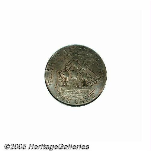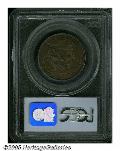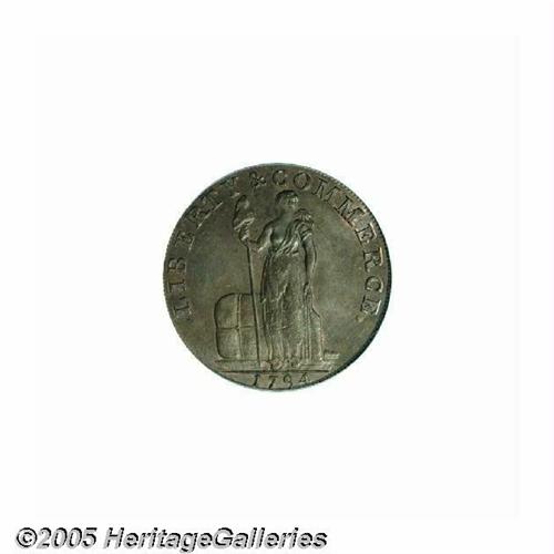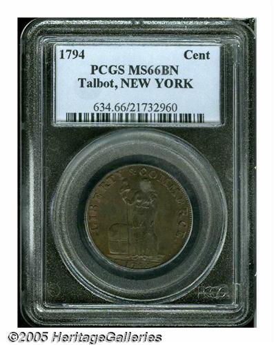 <B>1794<1C> Talbot, Allum & Lee Cent, NEW YORK MS66 Brown PCGS.</B></I> Breen-1032. These trade tokens were of great importance to the young American republic as they were extensively used in the channels of commerce in the 1790s, and many were cut down and used as planchets for half cents in 1795. Very rarely is a TAL encountered with this degree of preservation. The surfaces are glossy with brown centers and a significant presence of original red still in evidence around the margins. Listed on page 62 of the 2005 <I>Guide Book.</B></I>