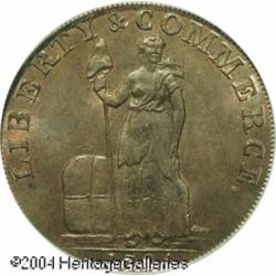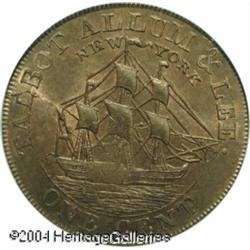 1794 1C Talbot, Allum & Lee Cent, NEW YORK MS66 Brow <B>1794 1C Talbot, Allum & Lee Cent, NEW YORK MS66 Brown PCGS.</B></I> These trade tokens were of great importance to the young American republic as they were extensively used in the channels of commerce in the 1790s, and many were cut down and used as planchets for half cents in 1795. Very rarely is a TAL encountered with this degree of preservation. The surfaces are glossy with brown centers and a significant presence of original red still in evidence around the margins. Listed on page 62 of the 2004 <I>Guide Book.</B></I> <BR><BR><B>Important notice:</B> Heritage usually auctions material at the rate of 200-250 lots per hour. On some occasions eBay Live bid software or the Internet may not be able to keep up with the pace of the auction. We recommend placing a realistic absentee bid now as insurance to avoid disappointment. Occasionally the auctioneer may eliminate or reject an eBay Live bid, and the auctioneer may also reopen a lot after the close of the eBay live bidding (usually because we missed an audience bid), and may reject your bid even if it shows you as the winning bidder. By bidding via eBay Live, you agree that Heritage may award the lot to another bidder at its sole discretion under the circumstances described above or any other reasonable circumstances. Since eBay bids are not shown to us until we open the lot on the floor, we treat those bids just like floor bids. In most cases the floor responds before the eBay bid is presented to us, due to Internet lag time, so for consistency we have made it a policy that floor bids are always considered first over tie eBay live bids. Also please note that all Heritage lots purchased through eBay Live carry a 20% Buyer's Premium. Please make sure you read the Terms and Conditions before you bid. This lot is being auctioned in conjunction with a live floor auction by Heritage Galleries & Auctioneers. All final auction and invoice information will be supplied by Heritage Galleries & Auctioneers, and all other information should be considered preliminary. Lot:5005