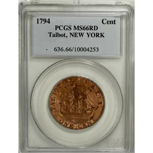 <B>1794 1C Talbot, Allum & Lee Cent, NEW YORK MS66 Red PCGS.</B></I> Breen-1029. This is the most extraordinary TAL Cent we have ever seen. This is the only full red example graded by either service in any grade. The surfaces are bright and show uniform, unmellowed color over both sides with sparkling, semi-prooflikeness. Sharply struck throughout. Per the consignor, this is the single highest graded Colonial coin, using the PCGS Registry system of awarding points.<BR><BR><b>Shipping:</b> Coins & Currency (<a target="_blank" href="http://www.heritageauctions.com/common/shipping.php">view shipping information</a>)