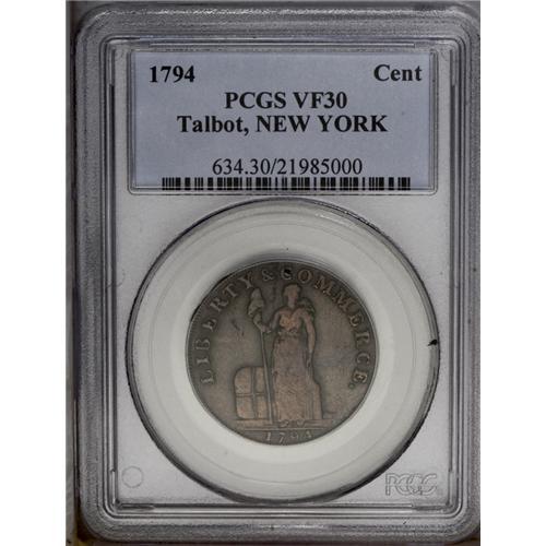 <B>1794<1C> Talbot, Allum & Lee Cent, NEW YORK VF30 PCGS.</B></I> Breen-1029. The variety with a large ampersand on the reverse. Scarcer in better grades than the 1795 Talbot, Allum & Lee Cent. This walnut-brown example has glossy rose highlights on the standing figure of Commerce. A few specks of dark verdigris are present. Listed on page 72 of the 2006 <I>Guide Book.</B></I> <BR><BR><B>Important notice:</B> Heritage usually auctions material at the rate of 200-250 lots per hour. On some occasions eBay Live bid software or the Internet may not be able to keep up with the pace of the auction. We recommend placing a realistic absentee bid now as insurance to avoid disappointment. Occasionally the auctioneer may eliminate or reject an eBay Live bid, and the auctioneer may also reopen a lot after the close of the eBay live bidding (usually because we missed an audience bid), and may reject your bid even if it shows you as the winning bidder. By bidding via eBay Live, you agree that Heritage may award the lot to another bidder at its sole discretion under the circumstances described above or any other reasonable circumstances. Since eBay bids are not shown to us until we open the lot on the floor, we treat those bids just like floor bids. In most cases the floor responds before the eBay bid is presented to us, due to Internet lag time, so for consistency we have made it a policy that floor bids are always considered first over tie eBay live bids. Also please note that all Heritage lots purchased through eBay Live carry a 20% Buyer's Premium. Please make sure you read the Terms and Conditions before you bid. This lot is being auctioned in conjunction with a live floor auction by Heritage Galleries & Auctioneers. All final auction and invoice information will be supplied by Heritage Galleries & Auctioneers, and all other information should be considered preliminary. Lot:180 <BR><BR><B>Winning Notification and Billing:</B> After the FINAL session in this auction is complete, Heritage will send e-mail and snail mail invoices. This process normally takes several days. All final auction and invoice information will be supplied by Heritage Galleries & Auctioneers, and all other information should be considered preliminary. <BR><BR>This auction will be conducted on a live auction floor and over the Internet through eBay Live. If you choose to place an absentee bid, please take a moment to <font color='#0000ff'><u><a href='http://pages.ebay.com/liveauctions/help/before/laabsentee.html'>learn how eBay Live absentee bidding works</a></u></font><font color='#000000'>
