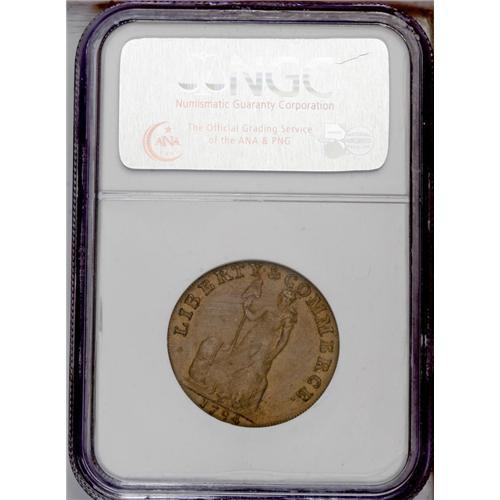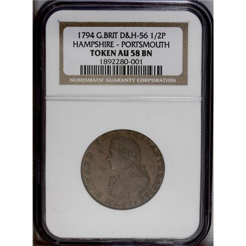 <B>1794<1C> Talbot, Allum & Lee/Iohn Howard Mule AU58 NGC.</B></I> Breen-1049. D&H-56 Hampshire-Portsmouth. Philanthropist John Howard is honored on the portrait side of this interesting Talbot, Allum & Lee mule. Die lumps in the left obverse field are as made, and characteristic of the issue. A smooth and pleasing chocolate-brown example. The strike is soft on portions of the devices, as is usually the case for the TAL token mules.