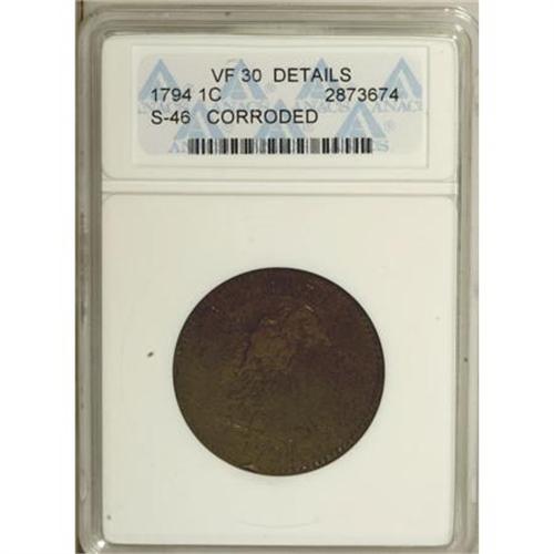 <B>1794 1C Head of 1794--Corroded--ANACS. VF30 Details.</B></I> S-46, B-36, R.3. Breen Die State V, the terminal die state with an internal die break above the 4 in the date. The consistently granular surfaces alternate between chocolate-brown and medium brown. The obverse has a rim ding at 6:30. EAC 10.<BR><BR><b>Shipping:</b> Coins & Currency (<a target="_blank" href="http://www.heritageauctions.com/common/shipping.php">view shipping information</a>)