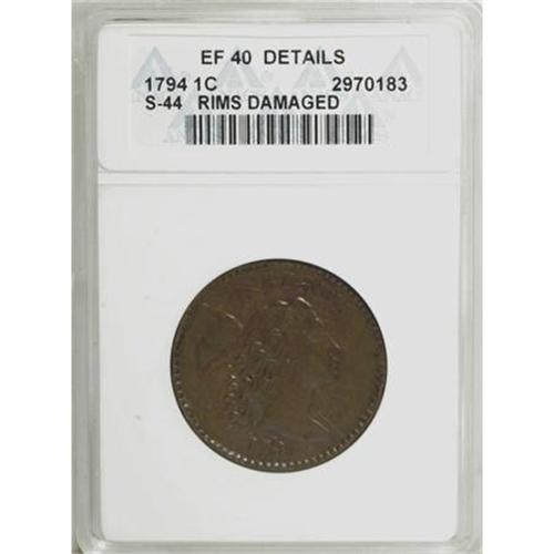 <B>1794 1C Head of 1794--Rims Damaged--ANACS. XF40 Details.</B></I> S-44, B-33, R.1. This is Breen's Die State III. A beautiful early copper despite the rim bumps, which show mostly on the reverse. The details are at least that of an EF, perhaps finer, and the medium mahogany-brown surfaces are pleasantly smooth, thus making the damage forgivable. EAC 10.<BR><BR><B>Coin Engraver:</B> Joseph Wright<BR><BR><b>Shipping:</b> Coins & Currency (<a target="_blank" href="http://www.heritageauctions.com/common/shipping.php">view shipping information</a>)