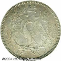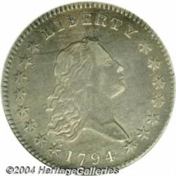 <B>1794<50C> AU50 NGC.</B></I> O-101a, R.4. This is the most obtainable variety from this scarce year, and is a real prize as such. It is also a later die state, with a die break from the rim to the wreath between UNITED and STATES. The O-101 is believed to be one of the final varieties struck in this year, despite Overton's order of listing; it was probably among the 18,164 pieces delivered February 4, 1795 from 1794 dated dies. The subvariety O-101(a), to which this piece belongs, is most easily distinguished by an additional die crack (as struck) on the reverse, with this die break extending from the rim through the F in OF, then turning upward at a sharp angle to just miss the outer berry, ending at the last S in STATES.<BR> Choice for the grade, the surfaces display deep olive-brown patina over both sides, with the only noticeable surface flaws being minor roughness on the lower obverse (as struck) from a poorly-prepared planchet, and a milling mark that resides on the upper left obverse field, just to the right of stars 6 through 8. It is interesting to note that, while only 23,464 examples of the first issue of United States half dollar were struck, no less than 10 die combinations were used from six obverse and six reverse dies, an extraordinary amount of work to put into such a small number of coins.<BR><I>From The Karl Scheible Collection.</B></I> <BR><BR><B>Important notice:</B> Heritage usually auctions material at the rate of 200-250 lots per hour. On some occasions eBay Live bid software or the Internet may not be able to keep up with the pace of the auction. We recommend placing a realistic absentee bid now as insurance to avoid disappointment. Occasionally the auctioneer may eliminate or reject an eBay Live bid, and the auctioneer may also reopen a lot after the close of the eBay live bidding (usually because we missed an audience bid), and may reject your bid even if it shows you as the winning bidder. By bidding via eBay Live, you agree that Heritage may award the lot to another bidder at its sole discretion under the circumstances described above or any other reasonable circumstances. Since eBay bids are not shown to us until we open the lot on the floor, we treat those bids just like floor bids. In most cases the floor responds before the eBay bid is presented to us, due to Internet lag time, so for consistency we have made it a policy that floor bids are always considered first over tie eBay live bids. Also please note that all Heritage lots purchased through eBay Live carry a 20% Buyer's Premium. Please make sure you read the Terms and Conditions before you bid. </span></font></tr></table></td></tr></table>