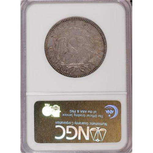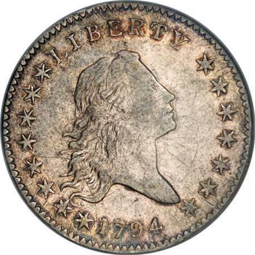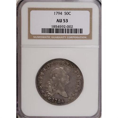 <B>1794 50C AU53 NGC.</B></I> O-105a, R.5. The attachment of star 2 to the lowest curl, a leaf attached to the right base of the I in AMERICA, and nine berries on each branch confirm the variety. This coin is the later die state 105a, as evidenced by the die crack from 11 o'clock at the reverse edge through the first T in STATES to the leaf. Furthermore, Al Overton indicates in his <I>Early Half Dollar Die Varieties </B></I>that this crack "... appears to cross the eagle and emerge from tip of right (facing) wing to edge below ER (in AMERICA)." The crack is indeed visible, albeit faintly, on the coin in the present lot.<BR> The Mint began its production of silver coinage in October 1794 with the dollar. After the coining of approximately 2,000 dollars, however, it became apparent that the largest press on hand was not powerful enough to completely strike up the design. Mint Director David Rittenhouse thus decided that half dollars be struck while the Mint was making arrangements for the construction of a larger and more powerful press.<BR> According to Mint records, 5,300 Flowing Hair half dollars were delivered on December 1, 1794 under Warrant number 2. Then, according to a November 26, 2002 Numismatic News article by researcher Robert Julian: "... a key piece of machinery broke down and it was some weeks before repairs could be completed." The next half dollar delivery occurred on February 4, 1795 with 18,164 pieces, per Warrant number 3. These were presumably dated 1794, giving the 1794 Flowing Hair half dollar a total mintage of 23,464 pieces. Julian estimates that between 250 and 350 specimens survive, most in "well-worn condition."<BR> The AU53 example in this lot displays light silver-gray patination, with blushes of golden-tan and sky-blue around portions of the borders. Both sides retain a good amount of luster for the grade, and the design features are well defined, including sharp delineation in most of Liberty's hair strands, the dentils, and the eagle's wing and tail feathers. Light adjustment marks are visible on Liberty's portrait and around the obverse border, and the only significance of a shallow scratch in the lower left obverse field is to help pedigree the coin. All in all, a pleasing example that will undoubtedly generate spirited bidding.<BR><BR><B>Coin Engraver:</B> Robert Scot<BR><BR><b>Shipping:</b> Coins & Currency (<a target="_blank" href="http://www.heritageauctions.com/common/shipping.php">view shipping information</a>)