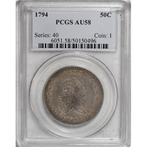 <B>1794 50C AU58 PCGS.</B></I> O-106, R.6. This variety is identified by the following: on the obverse, star 2 is attached to the lowest curl, the only 1794 so found, and star 1 is well below the curl; on the reverse, there are 21 berries, the only reverse with such (10 left and 11 right). It is important to note that the particular example presented here does not show a die crack from the edge to the pair of leaves below the first S of STATES. Donald Parsley, in his fourth edition of <I>United States Early Half Dollar Varieties, 1794-1836,</B></I> writes that: "All observed specimens show (this crack)." This coin is an early die state example of the O-106 variety, that may precede the other three varieties (O-101, O-107, and O-108) that also used this reverse.<BR><BR> This AU58 example is perhaps the finest known of the O-106 variety. Stephen Herrman, in his Autumn 2006 revision of <I>Auction & Mail Bid Prices Realized for Bust Half dollars, 1794-1839,</B></I> lists an AU53 specimen (Superior, Worrell Sale, September 1993) as the highest graded in his survey. This example and the Worrell Sale coin are actually the same, with an extensive earlier pedigree. We are also aware of one other high-grade piece, similar in quality to this specimen.<BR><BR> Golden-gray patination dominates both sides, and is imbued with blushes of sky-blue and lavender. Traces of luster reside in the recessed areas, and the design elements are well centered on the planchet. Liberty's hair displays excellent definition, as do the eagle's wing and tail feathers, and the dentilation is bold, especially on the reverse. Light diagonal adjustment marks traverse Liberty's portrait through stars 14 and 15; some vertical ones extend from the neck through the date. The surfaces are remarkably clean, the only pedigree identifier in addition to the obverse adjustment marks being a faint linear mark on the eagle's breast. Population: 3 in 58, 2 finer (6/07).<BR><I>Ex: George Earle (Henry Chapman, 6/1912); Gilhousen Collection (Superior, 10/1973); Superior (2/1975); Superior (2/1987); Superior (9/1993).</B></I><BR><BR><B>Coin Engraver:</B> Robert Scot<BR><BR><b>Shipping:</b> Coins & Currency (<a target="_blank" href="http://www.heritageauctions.com/common/shipping.php">view shipping information</a>\)