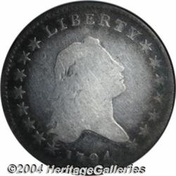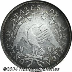 <B>1794<50C>--Cleaned--ANACS. VG Details, Net Good 6.</B></I> O-104, R.5. The first year of the two-year Flowing Hair half dollar type. On October 15, 1794, Chief coiner Henry Voigt delivered 5,300 half dollars, followed by 18,164 more on February 4, 1795, from 1794-dated dies. This relatively low mintage, combined with a low survival rate, makes the 1794 a scarce date coveted by early half dollar collectors. The Overton-104 variety is attributed by its reverse, which has 9 berries on the left wreath, and 10 berries on the right wreath. The present example features light-colored silverish centers, framed by medium gray and cobalt blue peripheries. Moderate hairlines occur over each side. Nicely centered, the dentilation shows on the reverse and along the left and upper borders of the obverse. The devices all show clearly, but most of the stars along the right obverse border are very weak. A few small pinscratches are noted on each side, but none are serious.<BR><I>From The Frank O. Fredericks Collection, Part Five.</B></I> <BR><BR><B>Important notice:</B> Heritage usually auctions material at the rate of 200-250 lots per hour. On some occasions eBay Live bid software or the Internet may not be able to keep up with the pace of the auction. We recommend placing a realistic absentee bid now as insurance to avoid disappointment. Occasionally the auctioneer may eliminate or reject an eBay Live bid, and the auctioneer may also reopen a lot after the close of the eBay live bidding (usually because we missed an audience bid), and may reject your bid even if it shows you as the winning bidder. By bidding via eBay Live, you agree that Heritage may award the lot to another bidder at its sole discretion under the circumstances described above or any other reasonable circumstances. Since eBay bids are not shown to us until we open the lot on the floor, we treat those bids just like floor bids. In most cases the floor responds before the eBay bid is presented to us, due to Internet lag time, so for consistency we have made it a policy that floor bids are always considered first over tie eBay live bids. Also please note that all Heritage lots purchased through eBay Live carry a 20% Buyer's Premium. Please make sure you read the Terms and Conditions before you bid. </span></font></tr></table></td></tr></table>
