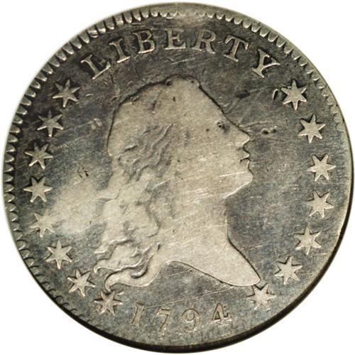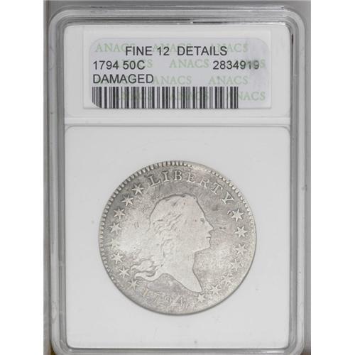 <B>1794<50C>--Damaged--ANACS. Fine 12 Details.</B></I> O-101, High R.3. This die pairing features the 21 berry reverse (arranged 10 and 11), the only such reverse of this desirable premier issue. Early half dollar specialists now believe the O-101 to be among the last marriages produced of the 1794. Glossy gunmetal and light gray surfaces display a series of light digs about the portrait, some of which might be interpreted as graffiti. The major devices as well as the date are clearly defined, which on a coin of this historical significance helps to offset its more obvious distractions. <BR><BR><B>Important notice:</B> Heritage usually auctions material at the rate of 200-250 lots per hour. On some occasions eBay Live bid software or the Internet may not be able to keep up with the pace of the auction. We recommend placing a realistic absentee bid now as insurance to avoid disappointment. Occasionally the auctioneer may eliminate or reject an eBay Live bid, and the auctioneer may also reopen a lot after the close of the eBay live bidding (usually because we missed an audience bid), and may reject your bid even if it shows you as the winning bidder. By bidding via eBay Live, you agree that Heritage may award the lot to another bidder at its sole discretion under the circumstances described above or any other reasonable circumstances. Since eBay bids are not shown to us until we open the lot on the floor, we treat those bids just like floor bids. In most cases the floor responds before the eBay bid is presented to us, due to Internet lag time, so for consistency we have made it a policy that floor bids are always considered first over tie eBay live bids. Also please note that all Heritage lots purchased through eBay Live carry a 20% Buyer's Premium. Please make sure you read the Terms and Conditions before you bid. This lot is being auctioned in conjunction with a live floor auction by Heritage Galleries & Auctioneers. All final auction and invoice information will be supplied by Heritage Galleries & Auctioneers, and all other information should be considered preliminary. Lot:1919 <BR><BR><B>Winning Notification and Billing:</B> After the FINAL session in this auction is complete, Heritage will send e-mail and snail mail invoices. This process normally takes several days. All final auction and invoice information will be supplied by Heritage Galleries & Auctioneers, and all other information should be considered preliminary. <BR><BR>This auction will be conducted on a live auction floor and over the Internet through eBay Live. If you choose to place an absentee bid, please take a moment to <font color='#0000ff'><u><a href='http://pages.ebay.com/liveauctions/help/before/laabsentee.html'>learn how eBay Live absentee bidding works</a></u></font><font color='#000000'>