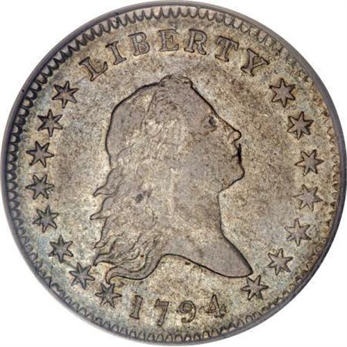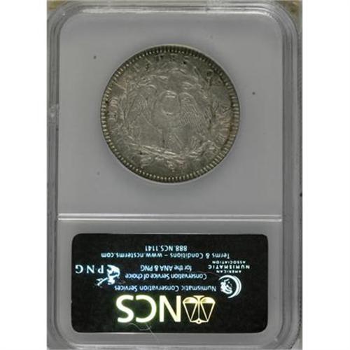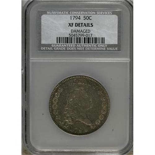 <B>1794 50C --Damaged--NCS. XF Details.</B></I> O-101, R.3. Far the most common 1794 variety, this is an excellent candidate for a date or type collector to represent the first year of issue half dollar. While the obverse surface is heavily abraded, the reverse is much nicer with only minor abrasions. There is no other evidence of damage, as far as we can determine. The obverse has lovely greenish-gold patina with traces of luster around the devices. The reverse is lighter silver with hints of gold and iridescent toning near the border. Hints of luster remain on the reverse as well.<BR><BR><B>Coin Engraver:</B> Robert Scot<BR><BR><b>Shipping:</b> Coins & Currency (<a target="_blank" href="http://www.heritageauctions.com/common/shipping.php">view shipping information</a>)