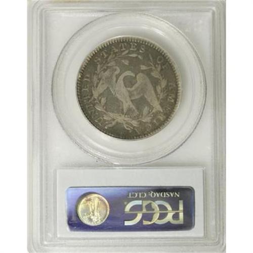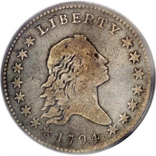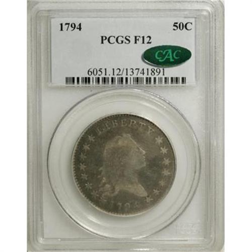<B>1794 50C Fine 12 PCGS. CAC.</B></I> O-101, High R.3. Star 1 pierces the lowest curl at midpoint, and star 2 is close to the second curl. Star 15 touches the bust tip. The reverse shows 21 berries (the only one such), with a faint die crack from the rim to a leaf pair below the first S. The surfaces are predominantly silver-gold, with darker grayish-gold highpoints. A couple of thin scrapes are noted through Liberty's portrait, only under a loupe, but the surfaces overall still show considerable appeal. The rims are full on each side, and the planchet is well-centered. Representing about 80% of all 1794 halves, the O-101 is a perfect choice for both date and type sets to represent the two-year Flowing Hair variety.<BR><BR><B>Coin Engraver:</B> Robert Scot<BR><BR><b>Shipping:</b> Coins & Currency (<a target="_blank" href="http://www.heritageauctions.com/common/shipping.php">view shipping information</a>)