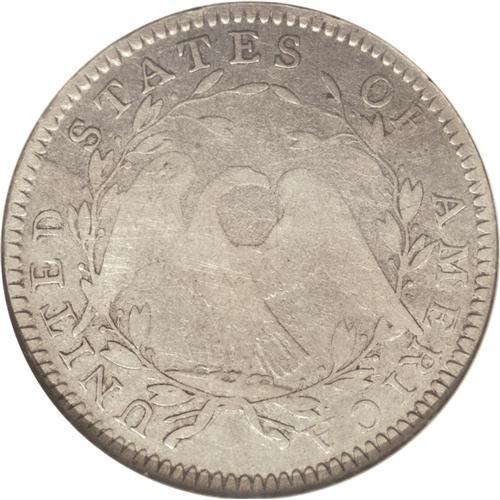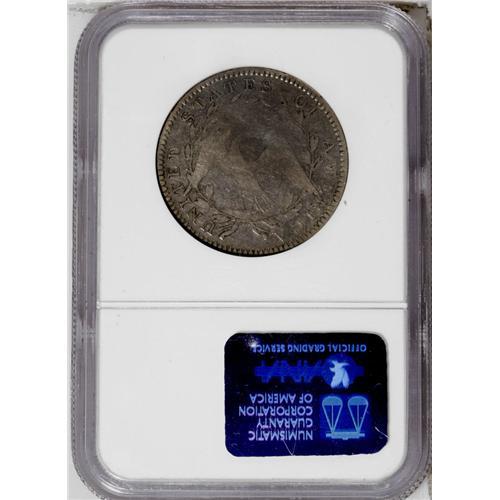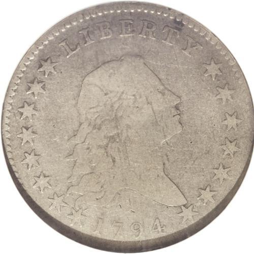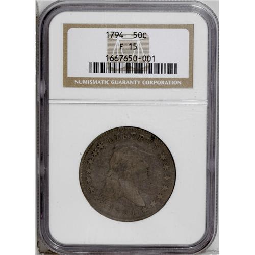 <B>1794<50C> Fine 15 NGC.</B></I> O-101, High R.3. Deep gray surfaces reveal powder-blue, lilac, and gold tints when they are rotated beneath a light. All legends, stars, and berries are present, and although wear is concentrated on the major devices, Liberty's hair displays some inner detail. A few faint slide marks are present, but these are trivial given the grade. Surprisingly, there are no relevant marks to provide a pedigree identifier. Among the three 1794 silver issues, only the half dimes are collectible in Mint State. The 1794 silver dollar is a famous rarity regardless of grade. 1794 halves are in between: they can be found with some difficulty in Good to VF grades, while XF and higher examples are nearly impossible to acquire. This Choice Fine representative will not break the bank of the first year type collector, but will be recognized as among the most important pieces within such a collection.