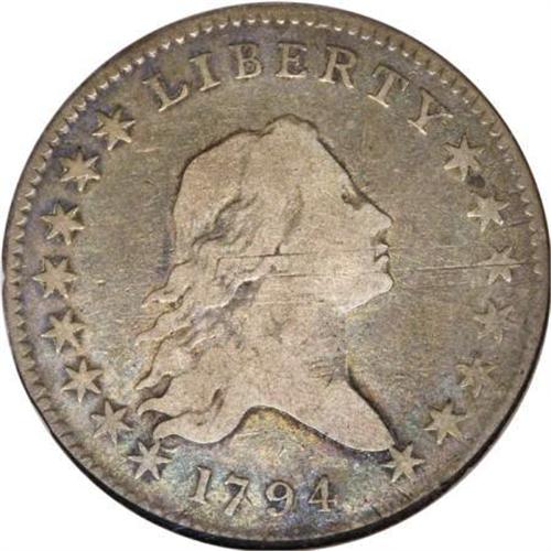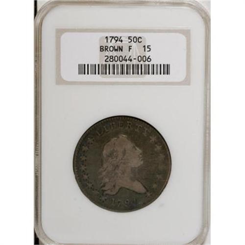<B>1794 50C Fine 15 NGC.</B></I> Ex: Brown Collection. O-104, R.5. This is the only die marriage with a 9 x 10 berry arrangement on the reverse. According to mint records, the first delivery of this issue was made on December 1, 1794, and totaled 5,300 coins. A second delivery of 18,164 half dollars of 1794 was made on February 4, 1795. <BR> This Fine 15 early die state exhibits natural gunmetal-gray color along with sky-blue, lilac, and gold accents. The design elements exhibit sharp detail for the grade, and both sides are devoid of significant contact marks. A few lengthy adjustment marks are noted on the right side of the obverse. A pleasing early half dollar.<BR><BR><B>Coin Engraver:</B> Robert Scot<BR><BR><b>Shipping:</b> Coins & Currency (<a target="_blank" href="http://www.heritageauctions.com/common/shipping.php">view shipping information</a>)