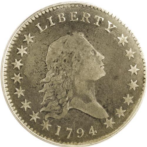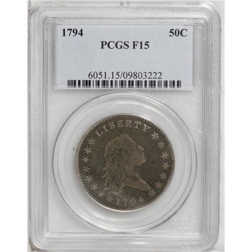 <B>1794<50C> Fine 15 PCGS.</B></I> O-101, R.4. This is an attractive example that will please the specialist as well as the date or type collector. The surfaces have natural, pale gray color, slightly deeper in the reverse fields and creating a two toned effect on that side. A few ancient scratches (resembling adjustment marks) are seen at the center of the reverse with light magnification. The diagnostic die crack from the reverse rim to the wreath between the D and S is clearly visible on this example. A highly desirable coin for the grade.
