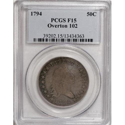 <B>1794 50C Fine 15 PCGS.</B></I> O-102, High R.6. This example is the second finest known for the variety and ranks as the finest recorded in the Census that was published in the April 2007 <I>John Reich Journal</B></I>. Only 12 or 13 examples of the O-102 die marriage are known, thus it ranks as a borderline R.7 variety. The fourth edition of Overton records a single XF40, two Fine 12, one VG 8, and a Good 4 as the five best recorded examples. It is believed that this piece is a different coin than either of the Fine 12 pieces recorded by Donald Parsley, editor of the fourth edition of the Overton reference. <BR> The obverse has a fine die crack from the border through star 7 into the field. There is no evidence of any reverse die defects.<BR> Pleasing medium gray surfaces exhibit brownish tendencies with deeper toning among the peripheral devices. Although a few faint adjustment marks are evident on the obverse, the surfaces on both sides are remarkably pleasing for the grade. The reverse has a minor flaw below the final S, resulting from impurities in the original planchet.<BR> The reverse is depicted on the Beistle plate from a different coin of about identical quality to this piece. This variety was not plated in the first or second editions of Overton. The plate in the third edition of Overton is much lower quality. In Hilt, the plate for his reverse E appears to be much finer quality, and may be taken from the XF40 example that is recorded in the Overton Census. Called "Exceedingly Rare" by Beistle.<BR> From the Eliasberg Collection, but no previous pedigree was recorded for this piece. It is highly probable that this example came from the famous Clapp Collection, off the market for more than 50 years prior to the 1997 offering of the Eliasberg half dollars.<BR> Not in Haseltine; Beistle 1-B; Overton-4; Hilt 6-E; PCGS# 6051, 39202; Encyclopedia-4552. <BR><I>Ex: Louis E. Eliasberg, Sr. (Bowers and Merena, 4/1997), lot 1661; Goldberg Coins (2/2001), lot 1720.<BR>From The Westmoreland County Collection of Early Bust Halves, 1794-1807.</B></I><BR><BR><B>Coin Engraver:</B> Robert Scot<BR><BR><b>Shipping:</b> Coins & Currency (<a target="_blank" href="http://www.heritageauctions.com/common/shipping.php">view shipping information</a>)