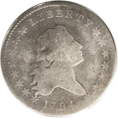 <B>1794<50C> Good 4 ANACS.</B></I> O-104, R.5. This variety is promptly identified by the boldly clashed set of dentils on the reverse between roughly 6 and 7 o'clock. Nicely detailed for the grade with smooth, well worn surfaces. The coin's only noteworthy abrasion occurs over and just below the E in STATES. A pleasing example of this scarce early variety.<BR><I>From The Catfish Creek Collection, Part Two.</B></I>