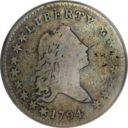 <B>1794 50C Good 4 PCGS.</B></I> O-105a, R.5. The obverse die appears to remain perfect without any defects. The reverse has a prominent central bulge, with a die crack through the upright of the first T in STATES, and later emerging through the wing tip to the border between E and R. It is assumed that this is a single bisecting die crack, although the bulge obliterates proof that it is just one crack. This is the important late die state, and one of just a few such pieces known. The population is certainly less than 10 examples known for the cracked reverse state.<BR>Both sides exhibit adequate details, although the central reverse is nearly smooth from the die bulge (technically a sinking die with the bulge on the coin). This characteristic gives the appearance of wear at the central reverse, although the peripheral details suggest a higher grade, perhaps as high as VG8. The surfaces have deep gray color with hints of champagne and pale blue color across nearly the entire obverse and reverse. A tiny reverse rim bruise is located at 6 o'clock.<BR>Haseltine-4; later than Beistle 3-Ea; Overton-11; Hilt 3-C; PCGS# 6051; Encyclopedia-4550.<BR><I>Ex: Heritage (3/2005), lot 5697.<BR>From The Westmoreland County Collection of Early Bust Halves, 1794-1807.</B></I><BR><BR><B>Coin Engraver:</B> Robert Scot<BR><BR><b>Shipping:</b> Coins & Currency (<a target="_blank" href="http://www.heritageauctions.com/common/shipping.php">view shipping information</a>)
