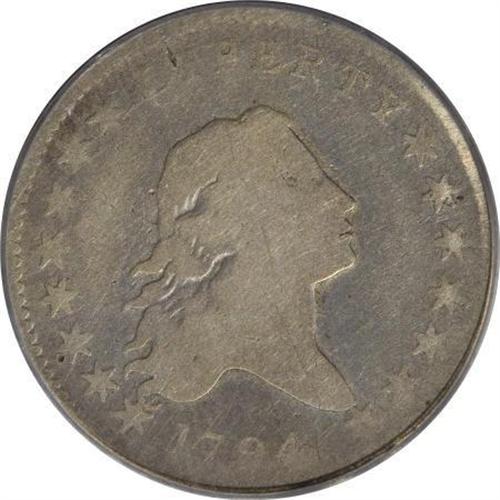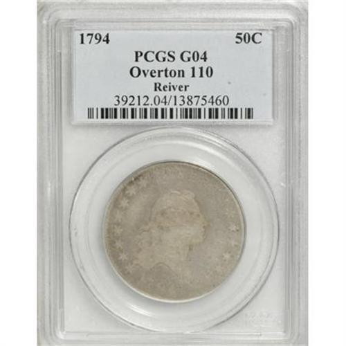 <B>1794 50C Good 4 PCGS.</B></I> O-110, R.7. Ex: Reiver. Only about five or possibly six examples of this variety are known. According to Jules' envelope, this is the discovery coin for the variety. We believe it to be the first specimen of this rare variety offered at public auction by Heritage Galleries (and the second appearance of this specimen). At any grade level, the O-110 is an obvious and undeniable rarity, which should pique the interest of any early half dollar specialist.<BR> Stars 1 and 15 are connected to Liberty's lowest hair curl and to the point of the bust, respectively. On the reverse, a heavy diametric die crack occurs, from the rim above the first A in AMERICA, extending across the upper reverse, and through the left side of the wreath. It is this curving die crack that fascinates the cataloger, as it appears like a retained cud (two parts of the die on different planes), except that the border is complete and even around much of the circumference, and the weaker details of the retained cud only appear immediately above the crack. It is almost as if the upper part of the die was tilted or canted slightly downward, creating a higher level on the coin, only next to the die crack itself. <BR> Fairly even wear is seen on both sides, and a few of the peripheral devices are partially worn away. The color is light-gray in the centers, deepening to dove-gray in the fields and near the borders. A few shallow indentations and wispy pinscratches are evident on each side.<BR> Not in Haseltine, Beistle, or Overton until the third edition; PCGS# 6051, 39212; Encyclopedia-4552.<BR><I>Ex: Werner; Jules Reiver Collection (Heritage, 1/2006), lot 22479; Discovery coin.<BR>From The Westmoreland County Collection of Early Bust Halves, 1794-1807.</B></I><BR><BR><B>Coin Engraver:</B> Robert Scot<BR><BR><b>Shipping:</b> Coins & Currency (<a target="_blank" href="http://www.heritageauctions.com/common/shipping.php">view shipping information</a>)