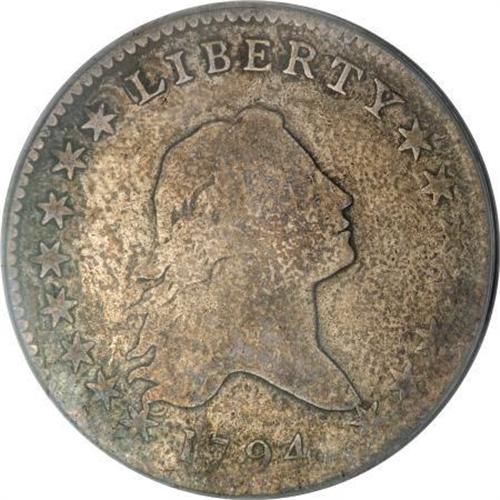 <B>1794 50C Good 6 PCGS.</B></I> O-104, R.5. Although the toning tends to obscure certain fine details, we do not see any evidence of the die cracks that appear on later examples.<BR>Dusky gold toning over light gray surfaces with traces of iridescent accents, subdues the appearance of this pleasing piece. A few fine scratches and other insignificant imperfections are consistent with the grade.<BR>This variety ranks among the more plentiful of all 1794 die marriages, and yet only 50 to 60 pieces are known in all grades. While O-101 is clearly the most common variety, O-104 and O-105 are also available with a little patience. All other 1794 varieties are rarer than these. While this specimen is not among Condition Census pieces, its early die state is particularly relevant to the advanced specialist.<BR>Haseltine-2; Beistle 2-C; Overton-5; Hilt 1-B; PCGS# 6051; Encyclopedia-4552.<BR><I>Ex: John Guisinger (Denver ANA, 8/2006).<BR>From The Westmoreland County Collection of Early Bust Halves, 1794-1807.</B></I><BR><BR><B>Coin Engraver:</B> Robert Scot<BR><BR><b>Shipping:</b> Coins & Currency (<a target="_blank" href="http://www.heritageauctions.com/common/shipping.php">view shipping information</a>)