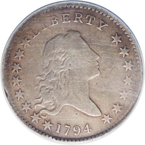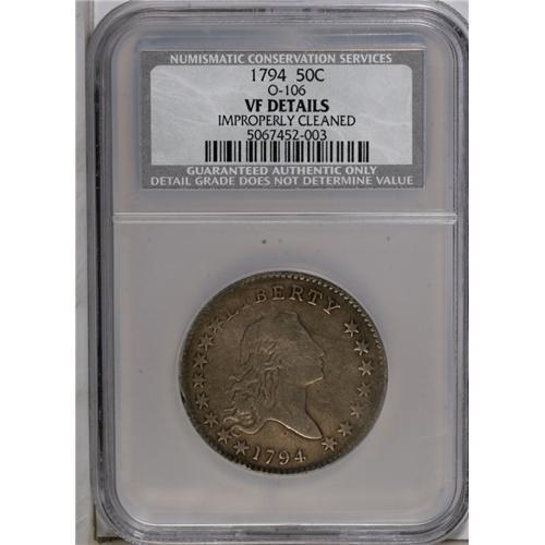 <B>1794<50C>--Improperly Cleaned--NCS. VF Details.</B></I> O-106, R.6. The second star joins the lowest curl, and the berries are arranged 10-11. Although the fields are a bit bright, they are still attractive, the color has retoned to silver-gray, and much pleasing detail is present. Tiny rim hits are noted at 7 and 8:30 on the obverse. The peripheral lettering is a bit weak at the tops of OF A and NITED. Despite the minor problems, still an appealing mid-grade example of this popular and rare variety.