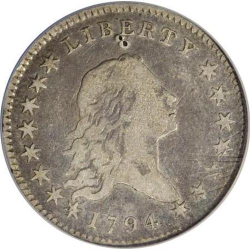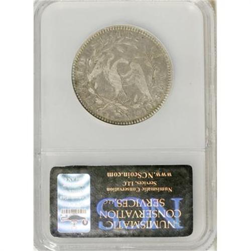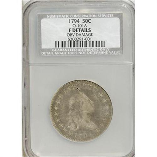 <B>1794 50C --Obverse Damage--NCS. Fine Details.</B></I> O-101a, R.4. A splendidly original 1794 half dollar that was previously part of the May 1990 Coin Galleries sale, lot 2586, where it was plated (envelope included). Adjustment marks at the right reverse rim are typical for the issue and are forgivable. The two attempted punctures under the E in LIBERTY, however, are not, hence encapsulation in an NCS holder. Still, this coin shows well and the flawless reverse grades Very Fine without question. This is actually a transitional die state between O-101 and O-101a, as the second reverse die crack from F in OF does not quite reach the second S in STATES. Considering that most Flowing Hair halves have impairments of some sort, the issues with the current coin should have little impact on the final hammer price.<BR><I>From The John Stimson, Sr. Collection, Part One.</B></I><BR><BR><B>Coin Engraver:</B> Robert Scot<BR><BR><b>Shipping:</b> Coins & Currency (<a target="_blank" href="http://www.heritageauctions.com/common/shipping.php">view shipping information</a>)