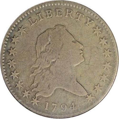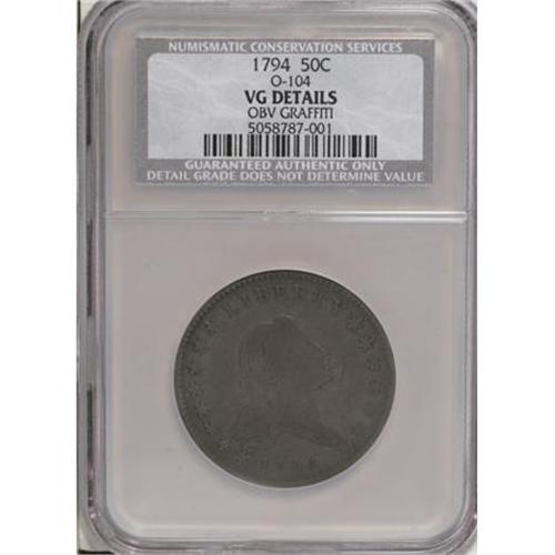 <B>1794 50C --Obverse Graffiti--NCS. VG Details.</B></I> O-104, R.5. Obverse star 1 touches left center of the lowest of Liberty's hair curls, and the reverse has 18 berries, 9 apiece on the left and right sides of the wreath. Both sides display uniform medium gray surfaces that are remarkably clean except for a finely engraved I or T in the right obverse field, and what appears to be part of a star in the left field. Otherwise, a very nice VG coin.<BR><BR><B>Coin Engraver:</B> Robert Scot<BR><BR><b>Shipping:</b> Coins & Currency (<a target="_blank" href="http://www.heritageauctions.com/common/shipping.php">view shipping information</a>)