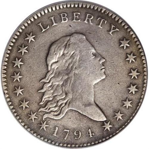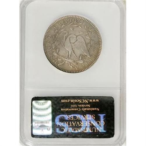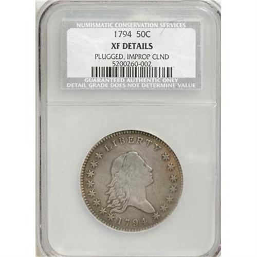 <B>1794 50C --Plugged, Improperly Cleaned--NCS. XF Details.</B></I> O-101, R.3. The most common 1794 half dollar variety is easily recognized by the combination of two features: the lowest star pierces the lowest curl just left of center, and a reverse die crack connects the border to the wreath about midway between the D and S. The population of the O-101 variety may be as high as 80% of the total population of all 1794 half dollars. Committing these two die characteristics to memory will significantly reduce the time and difficulty of attribution, with the bonus that any example not meeting these requirements is immediately recognized as a scarce or rare variety.<BR> This example has slightly rough light gray surfaces with hints of peripheral gold toning. Both sides are hairlined, with evidence of tooling or smoothing, in addition to the plug.<BR><BR><B>Coin Engraver:</B> Robert Scot<BR><BR><b>Shipping:</b> Coins & Currency (<a target="_blank" href="http://www.heritageauctions.com/common/shipping.php">view shipping information</a>)