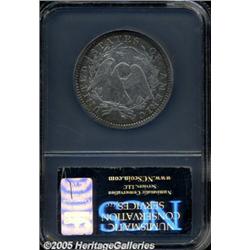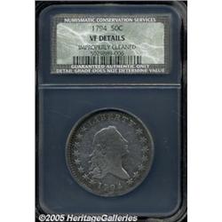 <B>1794 50C VF Details, Improperly Cleaned, NCS.</B></I> O-101, R.4. Although bright from a moderate cleaning, this nicely defined piece has since partly retoned in aqua and honey colors. There are no singularly heavy marks, only a couple of minor blemishes on the rim beneath the date. Seen much less often than the 1795, the 1794 has undeniable historical importance as the initial Half Dollar issue from the U.S. Mint.