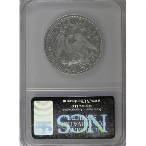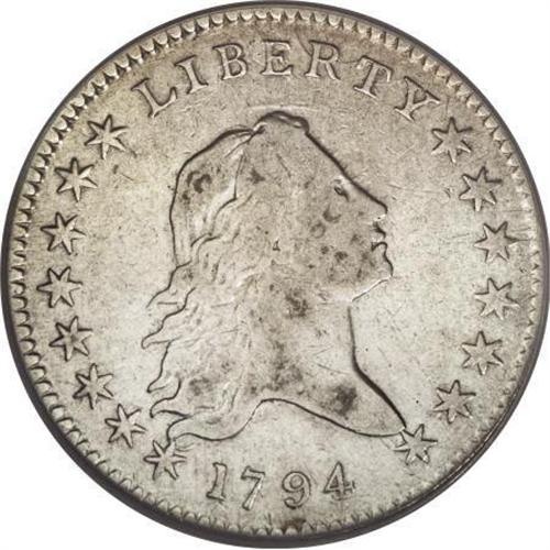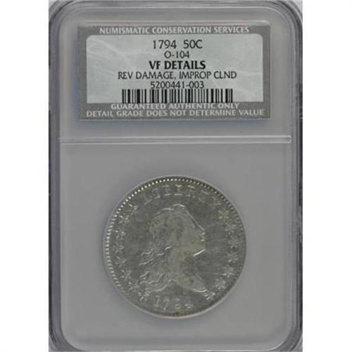 <B>1794 50C --Reverse Damage, Improperly Cleaned--NCS. VF Details.</B></I> O-104, R.5. O-101 is the usually encountered 1794 variety, and O-104 is considerably scarcer. O-104 comes with and without a rim cud at 4 o'clock on the reverse. It is curious that Overton failed to designate O-104a as the cud state, and O-104b as the state with the bisecting obverse break. This example has the cud, and it also has a small, round attempted puncture inside the U in UNITED. Untoned and lightly hairlined, but well detailed. Struck from multiply clashed dies.<BR><BR><b>Shipping:</b> Coins & Currency (<a target="_blank" href="http://www.heritageauctions.com/common/shipping.php">view shipping information</a>)