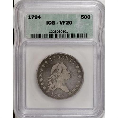 <B>1794 50C VF20 ICG.</B></I> O-104a, R.5. This piece represents an intermediate die state between O-104 and O-104a. The obverse appears perfect with no evidence of the die crack that appears on O-104a, or any other die defects. The reverse has a small rim break over ER of AMERICA, but it does not touch either letter.<BR> Both sides have light to medium gray surfaces with lighter silver color on the devices, and deeper gray near the borders. A few faint surface grazes and hairlines are visible, mostly on the obverse, along with the usual minor handling marks that are expected at this grade level.<BR> Probably fourth or fifth finest known among all states of the O-104 die combination. The Overton Census shows two AU50 coins and one XF40, followed by a couple pieces that grade just Fine 15. This piece is equal to fifth best in Steve Herrman's auction survey, although at least two of the finer pieces have serious imperfections.<BR> Haseltine-2; Beistle 2-Ca; Overton-7; Hilt 1-B; PCGS# 6051, 39205; Encyclopedia-4552.<BR><I>Ex: Robert Zornes.<BR>From The Westmoreland County Collection of Early Bust Halves, 1794-1807.</B></I><BR><BR><B>Coin Engraver:</B> Robert Scot<BR><BR><b>Shipping:</b> Coins & Currency (<a target="_blank" href="http://www.heritageauctions.com/common/shipping.php">view shipping information</a>)