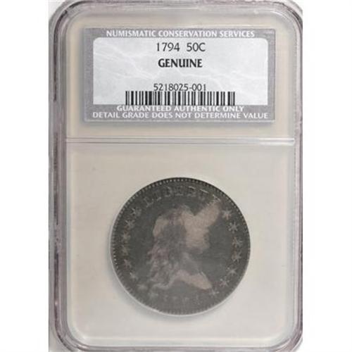 <B>1794 50C --Genuine--NCS. Sharpness of VF20.</B></I> O-101, R.3. Merely determined genuine by NCS, the sharpness grade is provided by the professional graders of our auction staff. The reverse has a long cut below the right wing, causing a bowed appearance on the obverse. Otherwise, this is a lovely, original example of the first half dollar coined in America.<BR><BR><B>Coin Engraver:</B> Robert Scot<BR><BR><b>Shipping:</b> Coins & Currency (<a target="_blank" href="http://www.heritageauctions.com/common/shipping.php">view shipping information</a>)