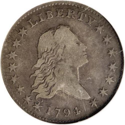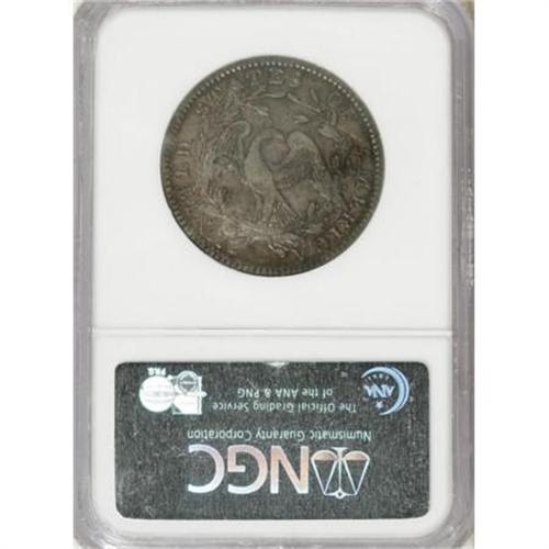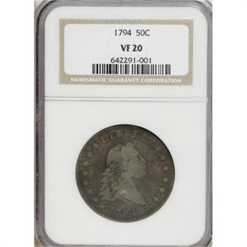 <B>1794 50C VF20 NGC.</B></I> O-107, R.6. Although Overton claims that all known examples show a reverse die crack between D and S, both sides of this piece appear to be perfect, thus this variety was struck before O-101, just like the O-106 above.<BR> When we offered this piece in May 2005, it was incorrectly attributed as O-101, but that did not stop bidders from recognizing its true identity as an O-107, based on the price it realized. It is the finest example of this rare variety that has been offered for public auction sale in many years. The surfaces are entirely lacking in distractions, other than the usual adjustment marks along the periphery, representing part of the minting process. Both sides of this mid-grade piece have deep steel-gray color that is accented by golden-brown toning, resulting in a sepia appearance.<BR> This piece ranks high in the Condition Census for the O-107 variety, probably third finest known. It is tied for the finest that has been offered in auction during the last several years, and ranks just behind a VF25 for second best honors, per the list in the fourth edition of Overton. The plate coin in Overton appears to be marginally sharper, but the two coins are quite similar in overall quality.<BR> Haseltine-7; Beistle 4-A; Overton 14; Hilt 4-D; PCGS# 6051, 39209; Encyclopedia-4552. <BR><I>Ex: Heritage (5/2005), lot 7091; Sheridan Downey (6/2005).<BR>From The Westmoreland County Collection of Early Bust Halves, 1794-1807.</B></I><BR><BR><B>Coin Engraver:</B> Robert Scot<BR><BR><b>Shipping:</b> Coins & Currency (<a target="_blank" href="http://www.heritageauctions.com/common/shipping.php">view shipping information</a>)