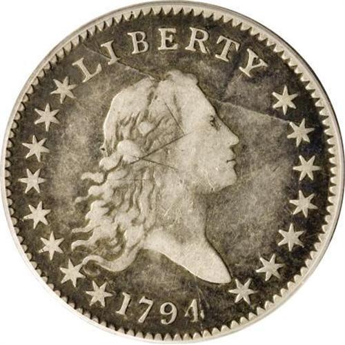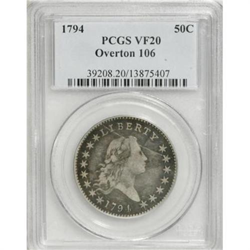<B>1794 50C VF20 PCGS.</B></I> O-106a, R.6. It was not until the fourth edition of Overton (2005), that the importance of this die state was rewarded with its own separate listing. The obverse has a heavy crack from the border to the base of I in LIBERTY, the top of Liberty's head just below the forelock, to star 10 and on to the border. Clash marks are visible along the upper edge of this crack to the left, but they stop perfectly at the crack, meaning the clash marks occurred after the die crack and are only visible on the part of the die that was on a slightly higher plane. The reverse is perfect, apparently as always in this die marriage.<BR> This piece is second finest known for the die state and probably about seventh or eighth finest for the variety. The Overton Collection coin is the only finer late die state piece that has been cataloged for auction in recent years.<BR> Both sides have intermingled steel and light gray, with lighter silver color on the devices. A few central obverse adjustment marks are evident, and both sides have the usual quota of slight circulation marks, but none are significant. <BR> Haseltine-6; Beistle 3a-A; Overton-13; Hilt 3-D; PCGS# 6051, 39208; Encyclopedia-4550.<BR><I>Ex: David Hall Rare Coins; Bowers and Merena (6/2003), lot 545; Harry Laibstain (6/2003).<BR>From The Westmoreland County Collection of Early Bust Halves, 1794-1807.</B></I><BR><BR><B>Coin Engraver:</B> Robert Scot<BR><BR><b>Shipping:</b> Coins & Currency (<a target="_blank" href="http://www.heritageauctions.com/common/shipping.php">view shipping information</a>)