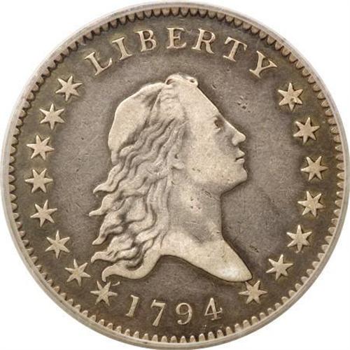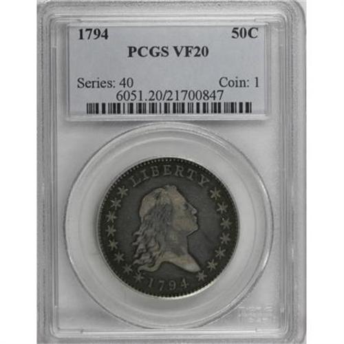 <B>1794 50C VF20 PCGS.</B></I> O-101, High R.3. This is the first die marriage of any date listed in Al Overton's classic reference text on early half dollars. It is also easily the most common variety of 1794, making it the obvious choice either for the date collector or the Flowing Hair type specialist. R.W. Julian estimates that between 250 and 350 pieces survive from this die pair, while the total original mintage for all 1794 half dollar varieties was 23,464. This coin is well detailed with charcoal-gray coloration near the peripheries, medium-gray toning in the fields, and a lighter silvery-gray cast on the central devices. Evenly worn with a few small planchet flaws on the obverse and several shallow adjustment marks across the reverse. <BR><BR><B>Coin Engraver:</B> Robert Scot<BR><BR><b>Shipping:</b> Coins & Currency (<a target="_blank" href="http://www.heritageauctions.com/common/shipping.php">view shipping information</a>)