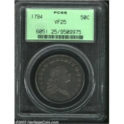 <TABLE cellSpacing=0 cellPadding=0 width="100%" bgColor=#000000 border=0><TBODY><TR><TD width="100%"><TABLE cellSpacing=1 cellPadding=3 width="100%" border=0><TBODY><TR><TD width="100%" bgColor=#79735c><FONT face=arial color=#ffffff size=3><B>Description</B> </FONT></TD></TR><TR><TD width="100%" bgColor=#ffffff><FONT face=arial size=2><B>1794 50C VF25 PCGS.</B></I> O-101a, R.4. Most easily distinguished by the 10-11 berry arrangement on the reverse, and the die crack through the F in OF. This is an attractive, evenly worn example that has deep gray-lilac surfaces that show tan patina over the highpoints. A few small abrasions are present, as one would expect for a coin in this grade, but there are no adjustment marks on either side. </FONT></TD></TR></TBODY></TABLE></TD></TR></TBODY></TABLE><BR><A name=PricesRealized></A><TABLE cellSpacing=0 cellPadding=0 width="100%" bgColor=#000000 border=0><TBODY><TR><TD width="100%"><TABLE cellSpacing=1 cellPadding=3 width="100%" border=0><TBODY><TR><TD width="100%" bgColor=#79735c><A name=PR><FONT face=arial color=#ffffff size=3><B>Previous Prices from Heritage Auctions</B> </FONT></A></TD></TR><TR><TD bgColor=#f6f6ed><TABLE cellSpacing=0 cellPadding=0 width="100%" border=1><TBODY><TR><TD align=middle width="33%"><B>Date</B></TD><TD align=middle width="33%"><B>Service</B></TD><TD align=middle width="33%"><B>Price</B></TD></TR><TR bgColor=whitesmoke><TD width="33%"><B>01/11/2003</B></TD><TD width="33%">PCGS</TD><TD width="33%">$8,280.00</TD></TR><TR bgColor=whitesmoke><TD width="33%"><B>03/22/1997</B></TD><TD width="33%">PCGS</TD><TD width="33%">$3,910.00</TD></TR><TR bgColor=whitesmoke><TD width="33%"><B>09/01/1998</B></TD><TD width="33%">PCGS</TD><TD width="33%">$5,060.00</TD></TR><TR bgColor=whitesmoke><TD width="33%"><B>05/27/2001</B></TD><TD width="33%">NGC</TD><TD width="33%">$6,038.00</TD></TR><TR bgColor=whitesmoke><TD width="33%"><B>08/08/2001</B></TD><TD width="33%">NGC</TD><TD width="33%">$6,037.50</TD></TR></TBODY></TABLE></TD></TR><TR><TD bgColor=#ffffff><FONT face=arial size=1 ?>PLEASE NOTE: All prices realized reflect the final hammer price PLUS the buyer's premium in auctions that charge a buyer's premium. Each item has a notation at the top of the listing indicating whether that lot included a buyer's premium. Example: A item that sells with a final hammer price of $100 and a 20% buyer's premium will display with a price realized of $120. All information listed is intended to be as accurate as possible, but errors are possible. Please use this guide carefully and inform us of any inaccuracies. </FONT></TD></TR></TBODY></TABLE></TD></TR></TBODY></TABLE><BR><TABLE cellSpacing=0 cellPadding=0 width="100%" bgColor=#000000 border=0><TBODY><TR><TD width="100%"><TABLE cellSpacing=1 cellPadding=3 width="100%" border=0><TBODY><TR><TD width="100%" bgColor=#79735c colSpan=6><FONT face=arial color=#ffffff size=3><B>Price Guide*</B> </FONT></TD></TR><TR bgColor=#f6f6ed><TD align=middle><B>Grade</B> </TD><TD align=middle><B>Coin World<BR>(Trends)</B> </TD><TD align=middle><B>Numismedia<BR>Retail</B> </TD><TD align=middle><B>Numismedia<BR>Wholesale</B> </TD><TD align=middle><B>Coin<BR>Universe</B> </TD><TD align=middle><B>Heritage<BR>Value Index</B> </TD></TR><TR bgColor=#ffffff><TD align=middle>20</TD><TD align=right>$8,000.00</TD><TD align=right>---</TD><TD align=right>---</TD><TD align=right>---</TD><TD align=right>$6,071.25</TD></TR><TR style="FONT-WEIGHT: bold" bgColor=#cccfdd><TD align=middle>25</TD><TD align=right>---</TD><TD align=right>---</TD><TD align=right>---</TD><TD align=right>---</TD><TD align=right>$6,955.94</TD></TR><TR bgColor=#ffffff><TD align=middle>30</TD><TD align=right>---</TD><TD align=right>---</TD><TD align=right>---</TD><TD align=right>---</TD><TD align=right>$7,787.50</TD></TR><TR bgColor=#ffffff><TD colSpan=6><FONT size=1>*All information listed is intended to be as accurate as possible, but errors are possible. No item may be returned or refused based on this information which is provided as a service to our customers. You should contact each pricing source directly to determine the accuracy of this information. </FONT></TD></TR></TBODY></TABLE></TD></TR></TBODY></TABLE><BR><TABLE cellSpacing=0 cellPadding=0 width="100%" bgColor=#000000 border=0><TBODY><TR><TD width="100%"><TABLE cellSpacing=1 cellPadding=3 width="100%" border=0><TBODY><TR><TD width="100%" bgColor=#79735c><FONT face=arial color=#ffffff size=3><B>Population Guide</B> </FONT></TD></TR><TR bgColor=#ffffff><TD align=middle><!-- Begin Output of Population Grid--><TABLE cellSpacing=0 cellPadding=0 width="100%" border=0><TBODY><TR><TD vAlign=center><TABLE cellSpacing=0 width="100%" border=1 cellsadding="3"><TBODY><TR><TD vAlign=center><TABLE cellSpacing=0 cellPadding=3 width="100%" border=1><TBODY><TR><TD vAlign=center align=middle bgColor=#f0f1e8 colSpan=2 <CENTER><FONT face=Arial size=2><B>PCGS Pop </B></FONT><CENTER></CENTER></TD><TD vAlign=center align=middle bgColor=#f0f1e8 colSpan=2><CENTER><FONT face=Arial size=2><B>NGC Pop</B></CENTER></FONT></TD></TR><TR><TD vAlign=center><FONT face=Arial size=2>(25)</FONT> </TD><TD vAlign=center align=right><FONT face=Arial size=2>21</FONT> </TD><TD vAlign=center><FONT face=Arial size=2>(25)</FONT> </TD><TD vAlign=center align=right><FONT face=Arial size=2>13</FONT> </TD></TR><TR><TD vAlign=center><FONT face=Arial size=2>(>25)</FONT> </TD><TD vAlign=center align=right><FONT face=Arial size=2>32</FONT> </TD><TD vAlign=center><FONT face=Arial size=2>(>25)</FONT> </TD><TD vAlign=center align=right><FONT face=Arial size=2>52</FONT> </TD></TR></TBODY></TABLE></TD></TR></TBODY></TABLE></TD></TR></TBODY></TABLE><!-- End Output of Population Grid--> Important notice: Heritage usually auctions material at the rate of 200-250 lots per hour. On some occasions eBay Live bid software or the Internet may not be able to keep up with the pace of the auction. We recommend placing a realistic absentee bid now as insurance to avoid d