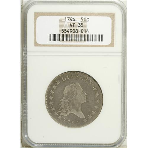 <B>1794 50C VF35 NGC.</B></I> O-101a, R.4. This variety is the only plentiful die marriage of the year, and it is usually identified by the reverse crack from the border to the wreath between the D and first S. The reverse has additional cracks described for die state a of this marriage. Well centered and problem-free with medium gray toning over most of each side and pale gray accents over the devices. Any 1794 half dollar, regardless of grade, is an important and highly desired piece. Those in grades of VF or finer are seldom seen, especially with pleasing problem-free surfaces.<BR><BR><b>Shipping:</b> Coin/Currency (<a target="_blank" href="http://www.heritageauctions.com/common/shipping.php">view shipping information</a>)
