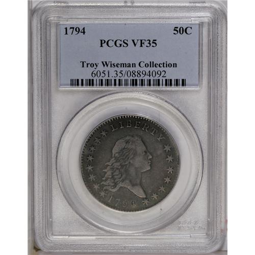 <B>1794<50C> VF35 PCGS.</B></I> O-101a, R.4. Of the 11 known die varieties of 1794 half dollars, only the Overton-101 variety is relatively easy to obtain, thus it is the variety most often chosen by date and type collectors. The first delivery of 1794 half dollars consisted of 5,300 coins. Conflicting sources record the date as either October 15 (the same date as the first silver dollars), or December 1. An additional quantity of 18,164 pieces were delivered by the chief coiner on February 4, 1795, and these two deliveries represent what is believed to be the entire mintage of half dollars dated 1794. This combined total of 23,464 coins is recorded in the <I>Guide Book</B></I> and other references as the mintage for this date. Combined rarity ratings suggest that about 540 pieces survive today, although the actual total may be somewhat higher. This is a lovely example with deep gray and steel color, accented by ivory and cobalt-blue on the reverse. A few insignificant abrasions and faint scratches are evident, but consistent with the grade. The die crack recorded for the O-101a die state is faintly visible on this example. Population: 14 in 35, 15 finer (7/06).<BR><I>From The Troy Wiseman Collection.</B></I>