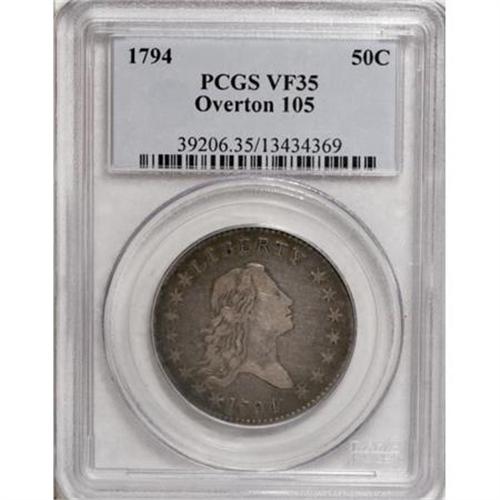 <B>1794 50C VF35 PCGS.</B></I> O-105, R.5. This is the usual early die state with both dies apparently perfect. Another plentiful 1794 die marriage along with O-101 and O-104, there are possibly as many as 60 examples of this die variety known in a wide range of grades.<BR> The sharpness of this piece is finer than the Overton plate coin. Both sides exhibit peripheral adjustment marks, faint scratches (particularly on the obverse), and surface roughness (most noticeably on the reverse). The devices have light tan color with slightly deeper gray in the fields and iridescent peripheral toning. <BR> A delightful example that probably ranks third or fourth finest known for the variety, despite its impairments. The finest piece recorded by Parsley in the fourth edition of Overton is just VF30, although at least three pieces grade XF or AU, including the amazing AU58 grade coin from the Eliasberg Collection. The Westmoreland County specimen is similar quality to an example that appeared in a September 2002 Goldberg auction, but not the same coin.<BR> The Haseltine reference describes varieties in a single collection, including grades and brief physical characteristics for some examples. The coin used to describe this variety was recorded as "good; slight nick over the word ‘Liberty.' " Although these coins were not plated, it may be possible to identify a few of them through careful examination of known examples.<BR> Haseltine-4; Beistle 3-E; Overton-9; Hilt 3-C; PCGS# 6051, 39206; Encyclopedia-4550.<BR><I>Ex: Alpine Numismatics (12/1999).<BR>From The Westmoreland County Collection of Early Bust Halves, 1794-1807.</B></I><BR><BR><B>Coin Engraver:</B> Robert Scot<BR><BR><b>Shipping:</b> Coins & Currency (<a target="_blank" href="http://www.heritageauctions.com/common/shipping.php">view shipping information</a>)